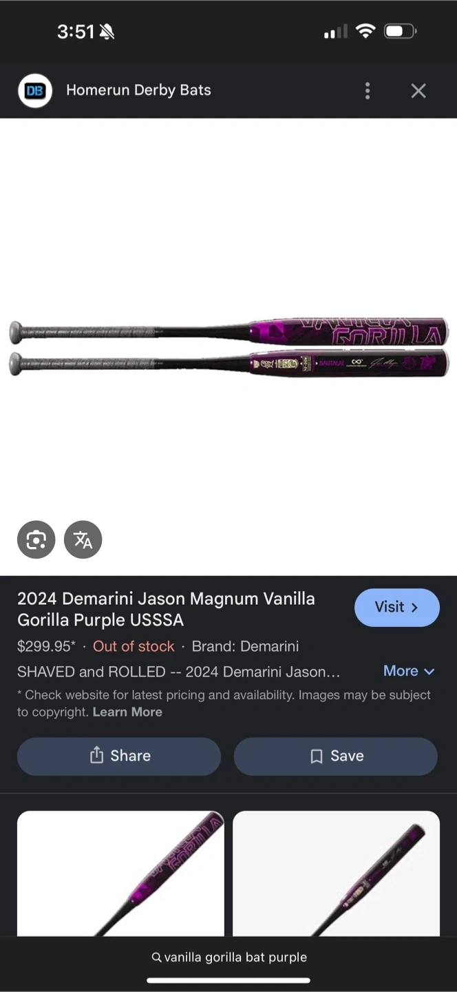 Looking to sell a Demarini Jason Magnum Vanilla Gorilla baseball bat in purple! It's USSSA certified. Let me know if you're interested! As well as a DC31. Both used for one season just getting worked in