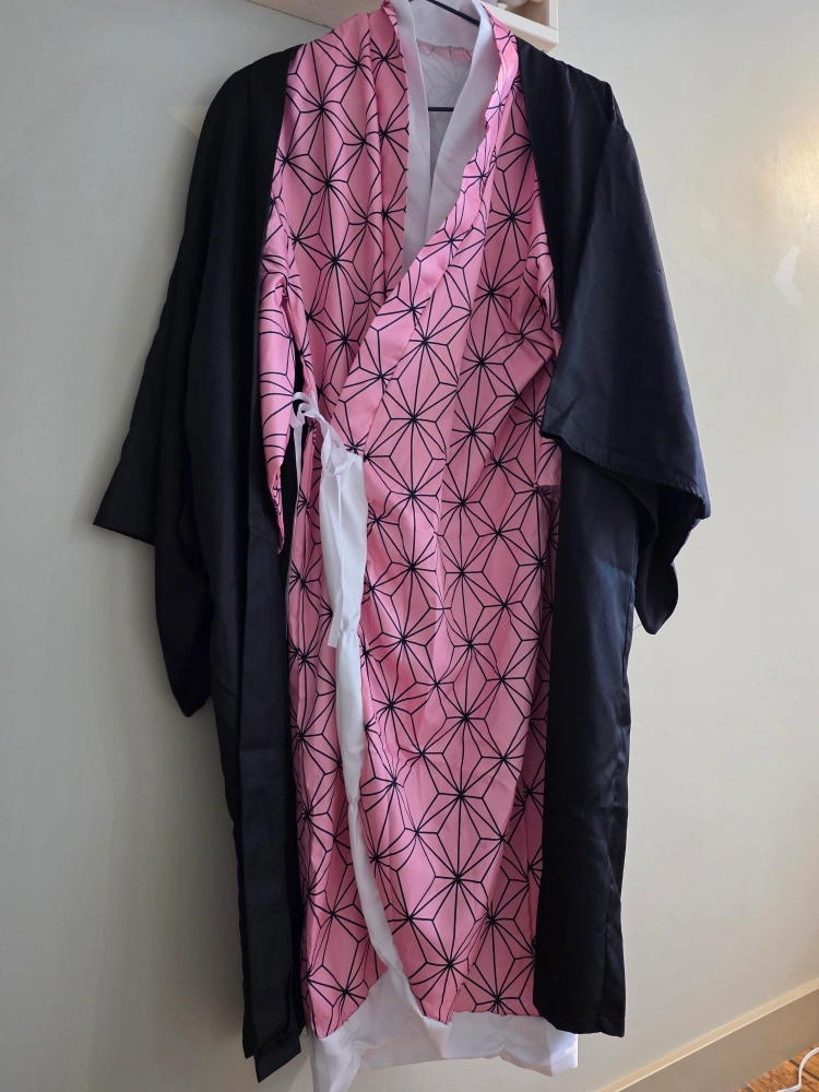 Selling a Nezuko Kamado cosplay costume from Demon Slayer! The costume includes the kimono, haori, leg warmers, belt, and bamboo muzzle small