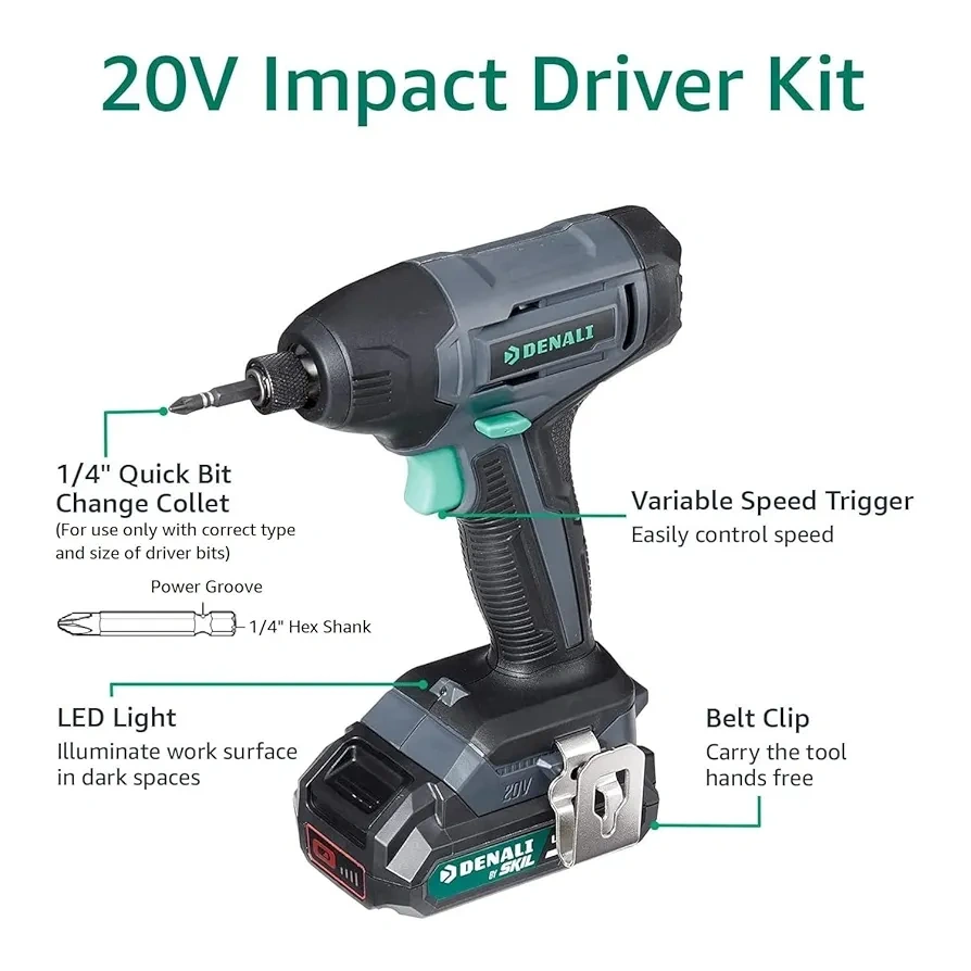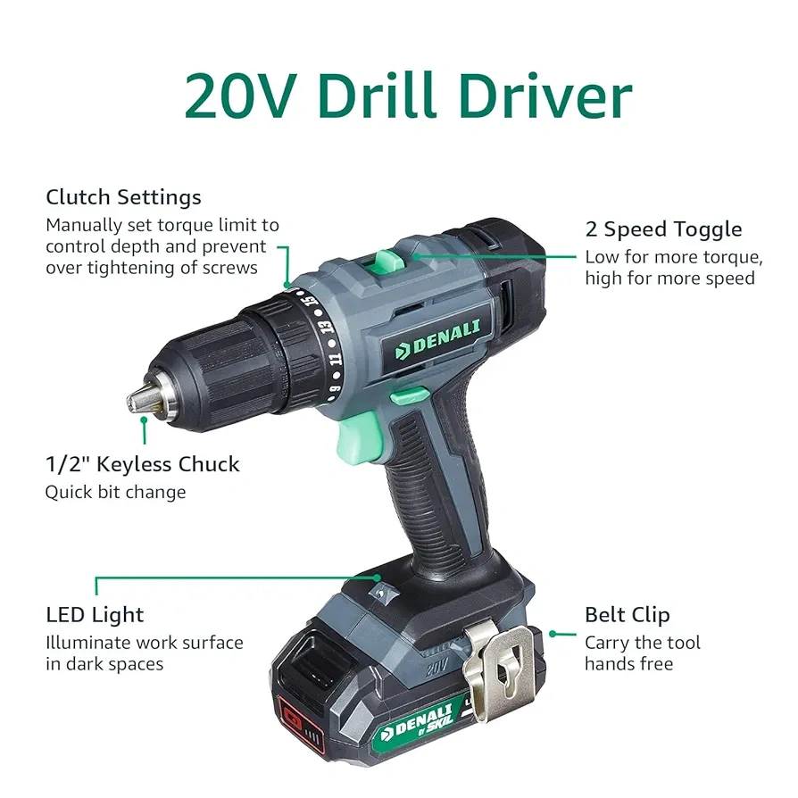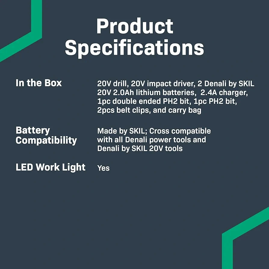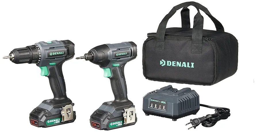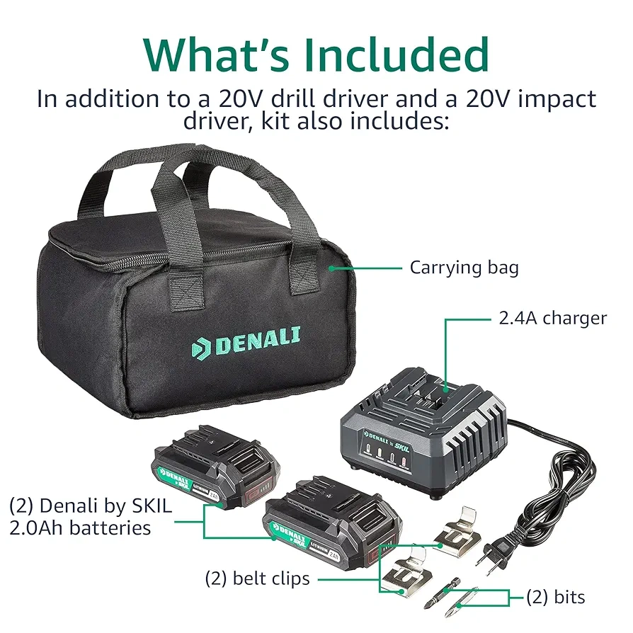 Selling a Denali by Skil 20V drill and impact driver kit. This kit includes: - 20V drill - 20V impact driver - 2 Denali by SKIL 20V 2.0Ah lithium batteries - 2.4A charger - 1pc double ended PH2 bit - 1pc PH2 bit - 2pcs belt clips - Carry bag Both tools feature an LED light to illuminate your work surface and a belt clip for hands-free carrying