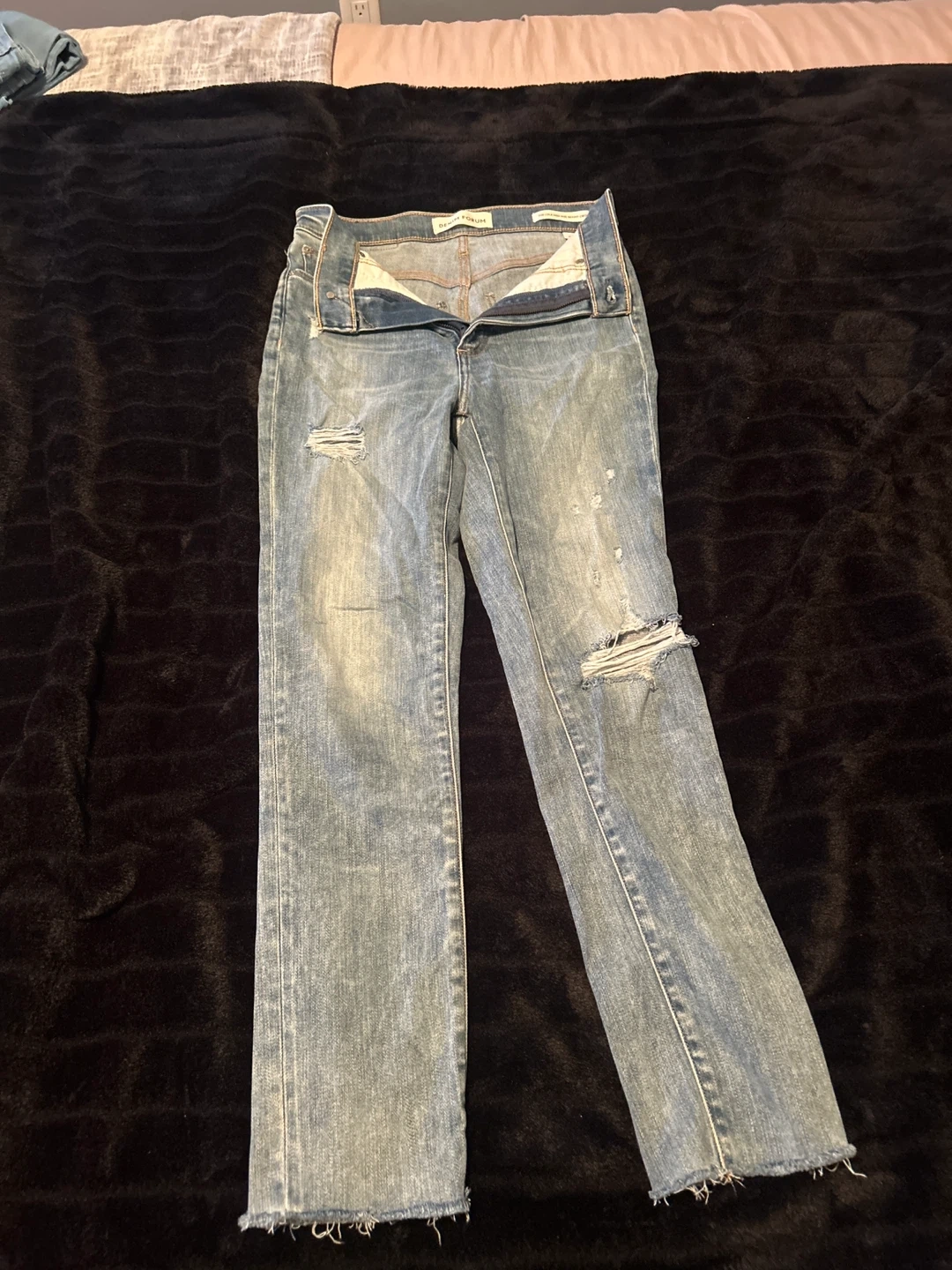 Selling a pair of Denim Forum Lola High Rise Skinny Crop jeans in size 28. These jeans have a stylish, slightly distressed look with some rips and a cropped length. They're perfect for a casual, trendy outfit!