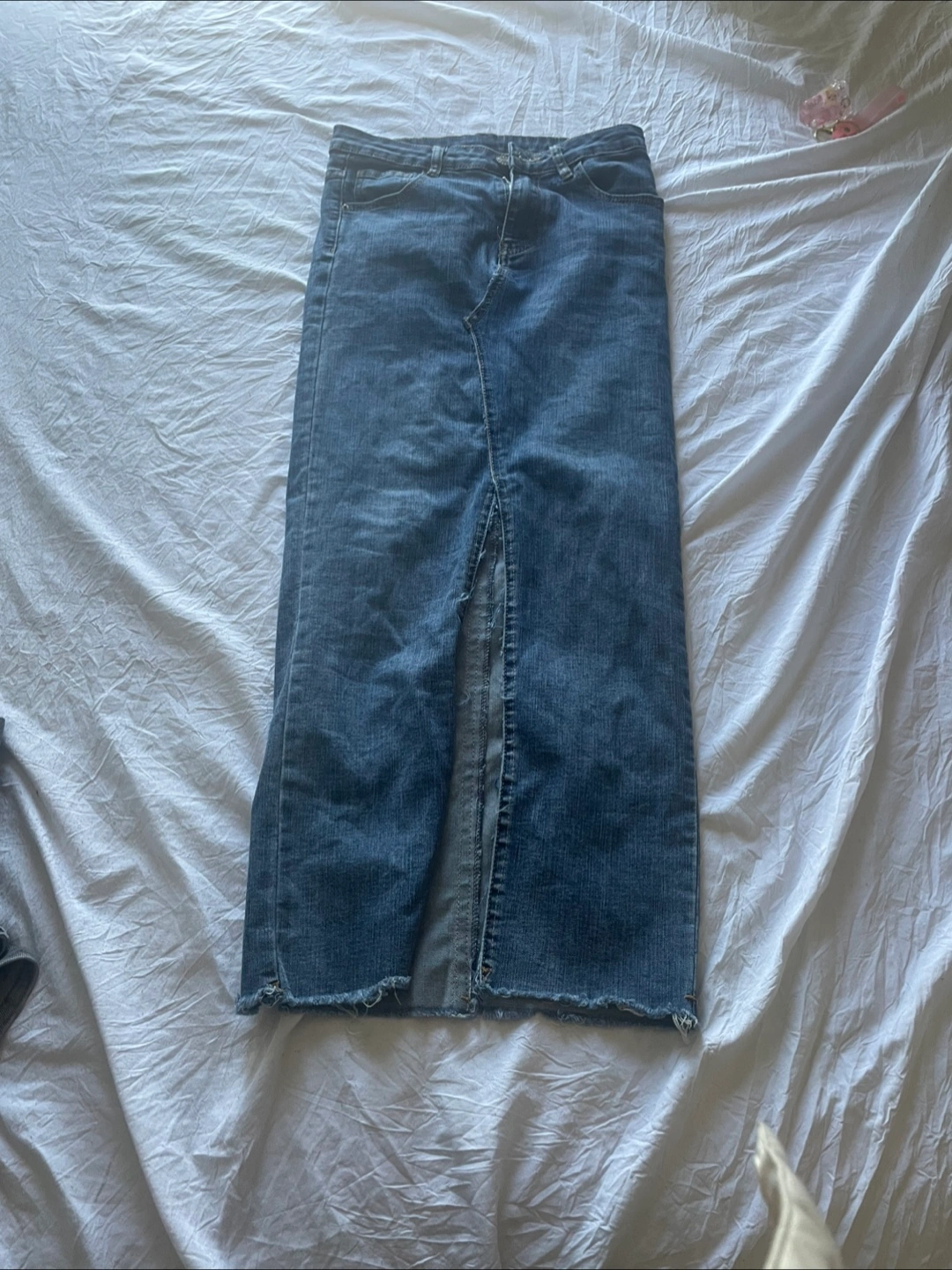 A cute denim skirt in a light blue wash! Perfect for everyday wear. It has a slit in the front.