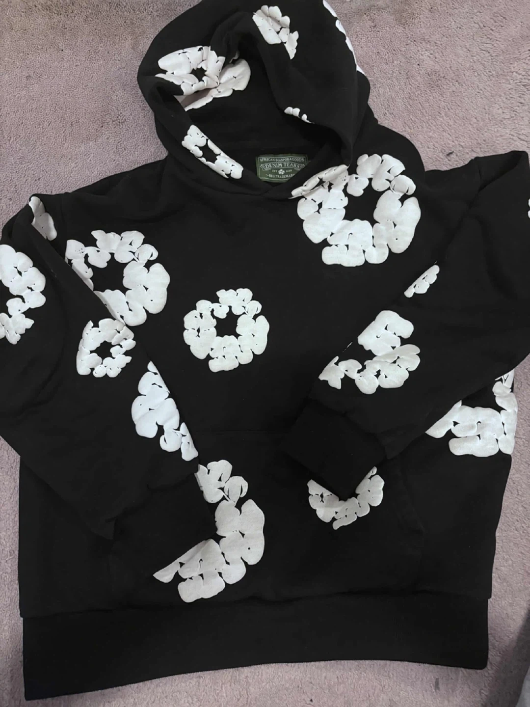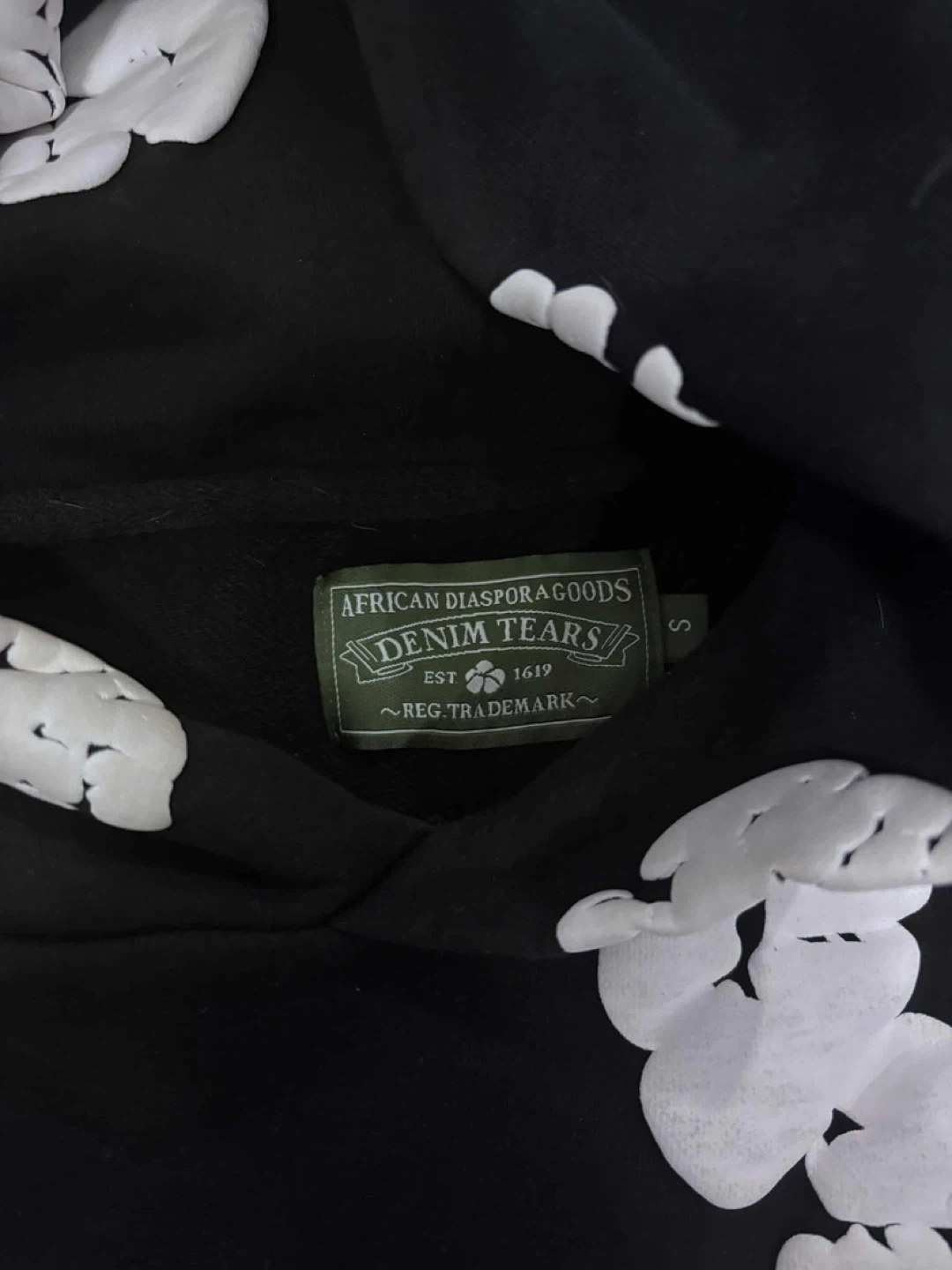 Selling a Denim Tears hoodie from their African Diaspora Goods line. It's black with white floral designs and is a size small. The hoodie is in great condition and ready for a new home!