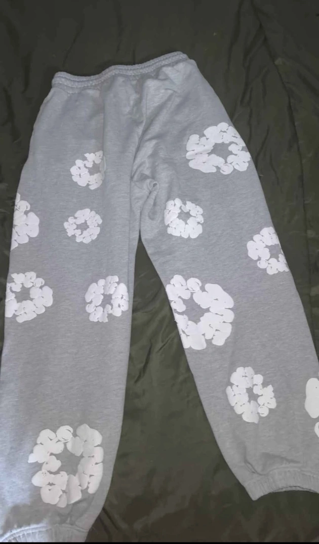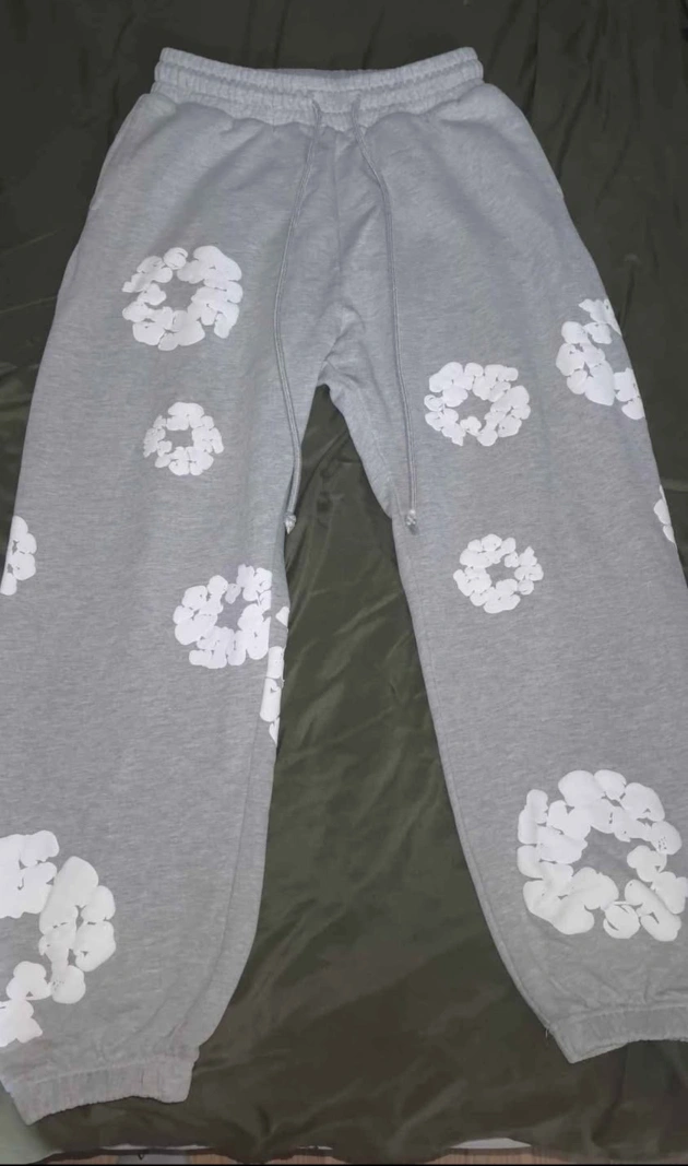 Selling a pair of grey sweatpants with a white floral design. They're super comfy and in great condition! Perfect for lounging around the house or running errands. The material is soft and cozy, making them ideal for any season Cash Only Pick up Only