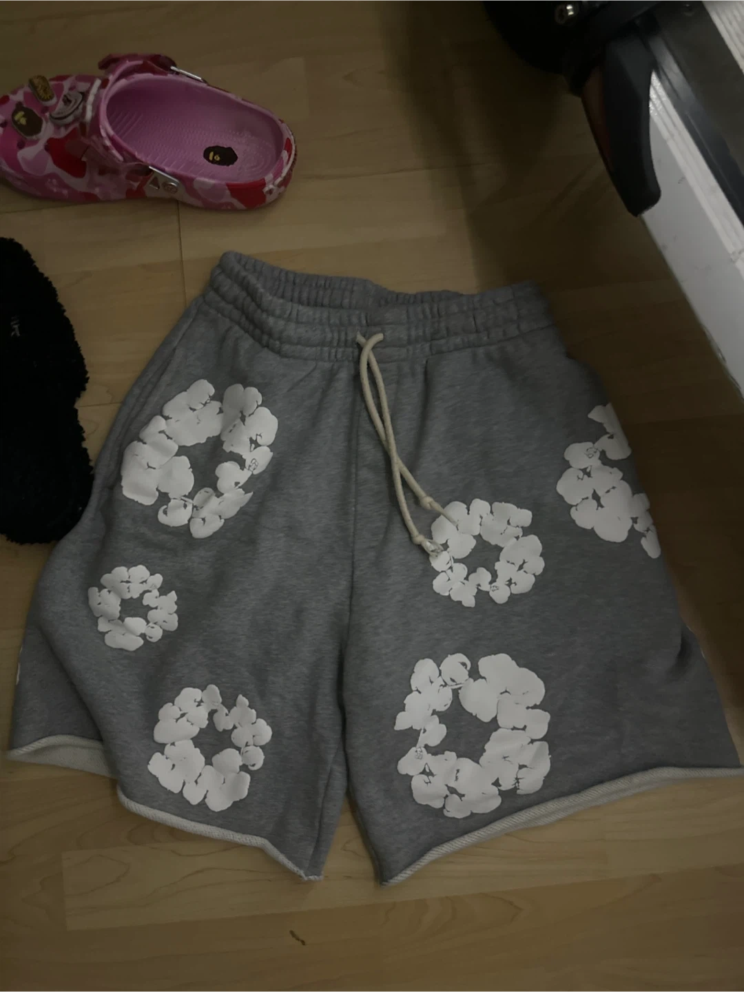 Selling a pair of grey shorts with a unique floral design. They're super comfy and perfect for lounging around the house or a casual day out. The shorts have a drawstring waist for a flexible fit. They are in great condition!