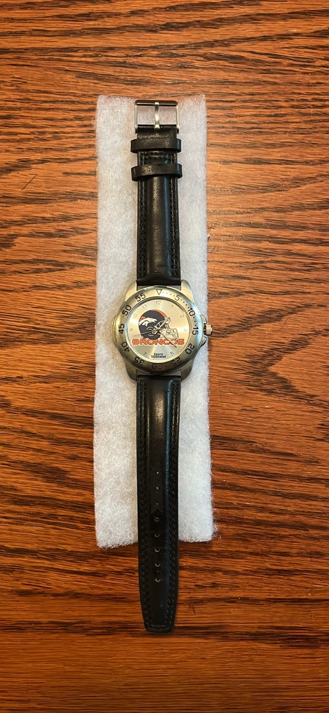 Selling a Denver Broncos Sports Illustrated watch. The watch has a black leather band and the team logo on the face. Perfect for any Broncos fan!