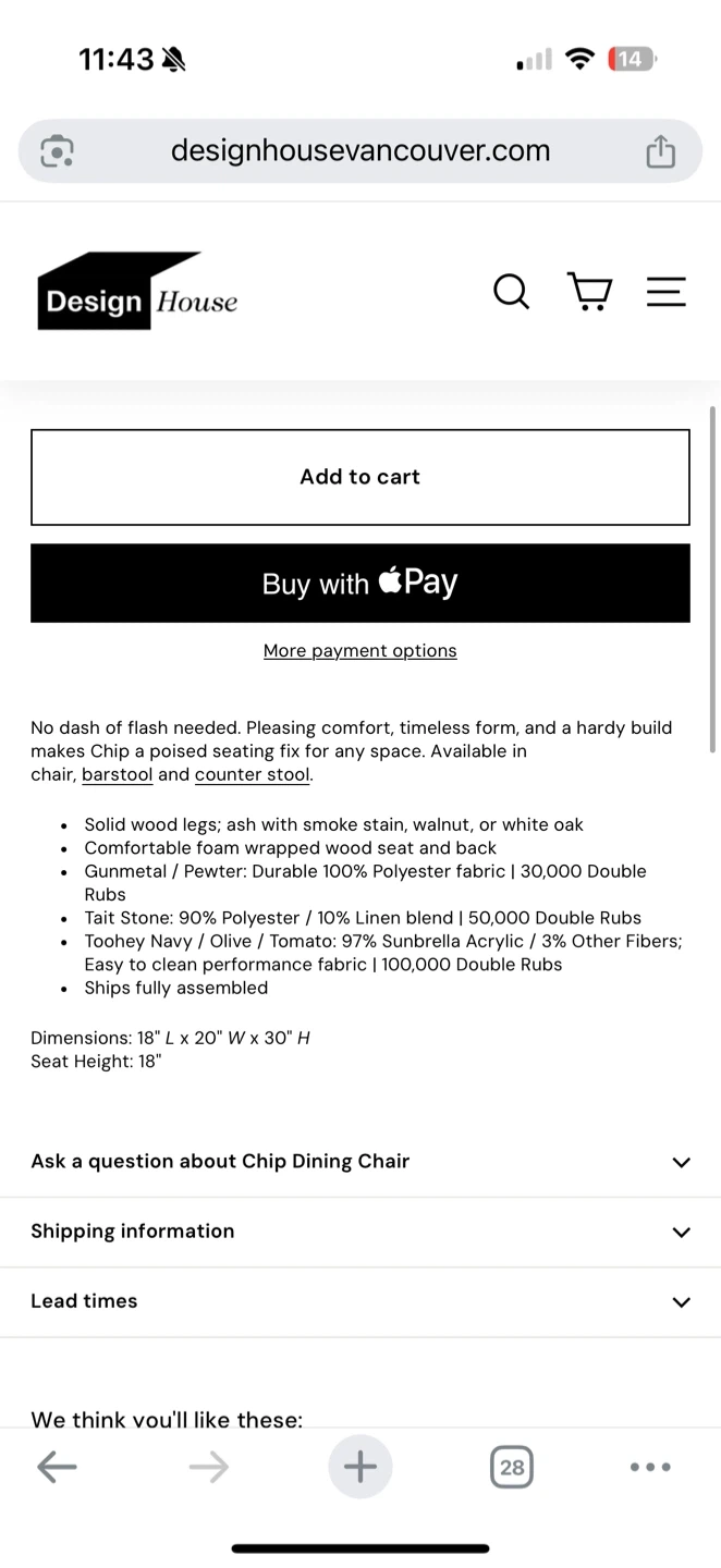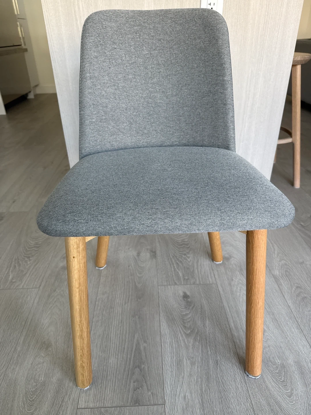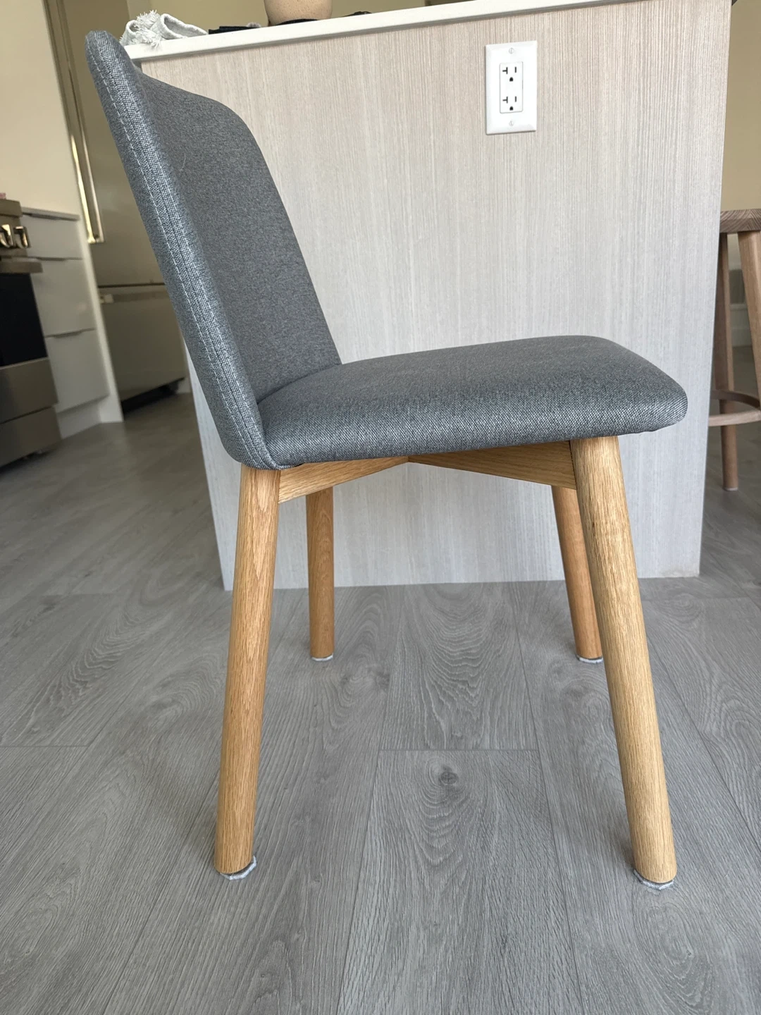 Selling 4 Design House Vancouver Chip Dining Chair. It features solid wood legs and comfortable foam-wrapped seat and back. The fabric is a durable 100% polyester. Dimensions are 18" L x 20" W x 30" H, with a seat height of 18"