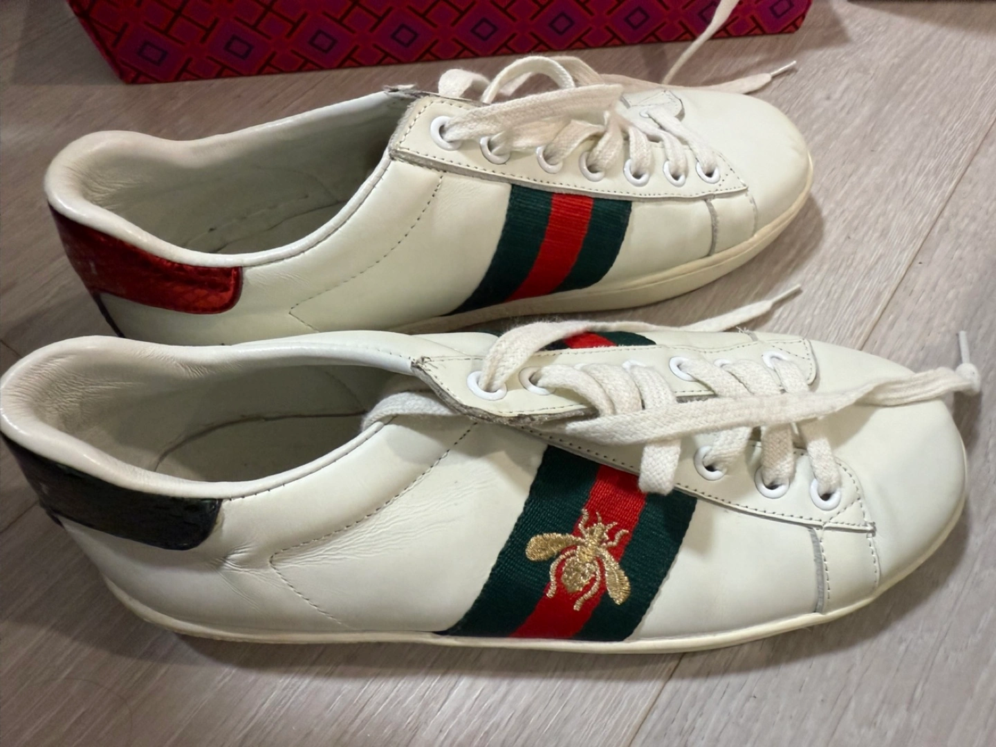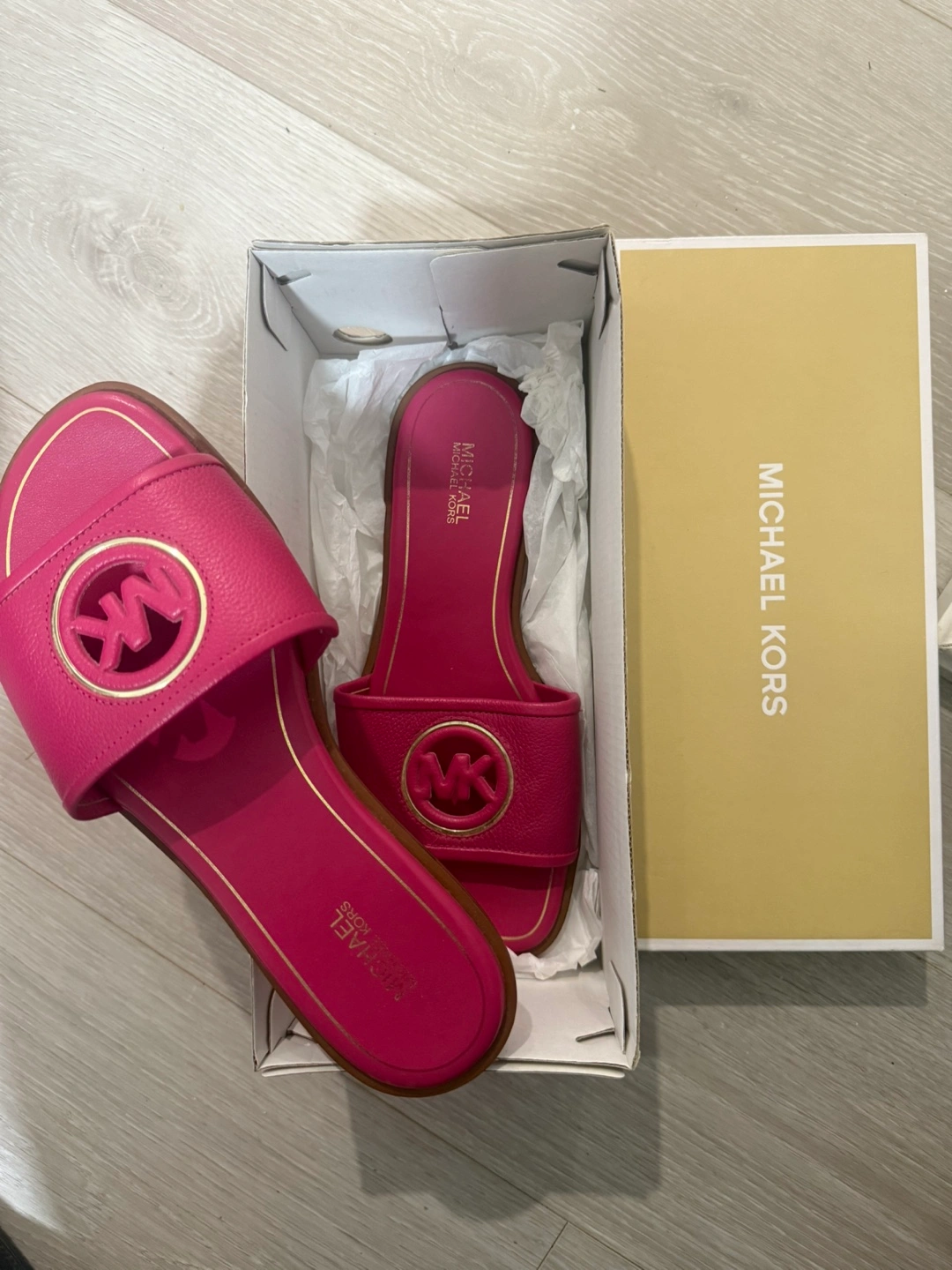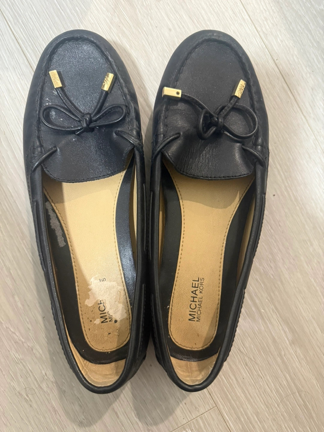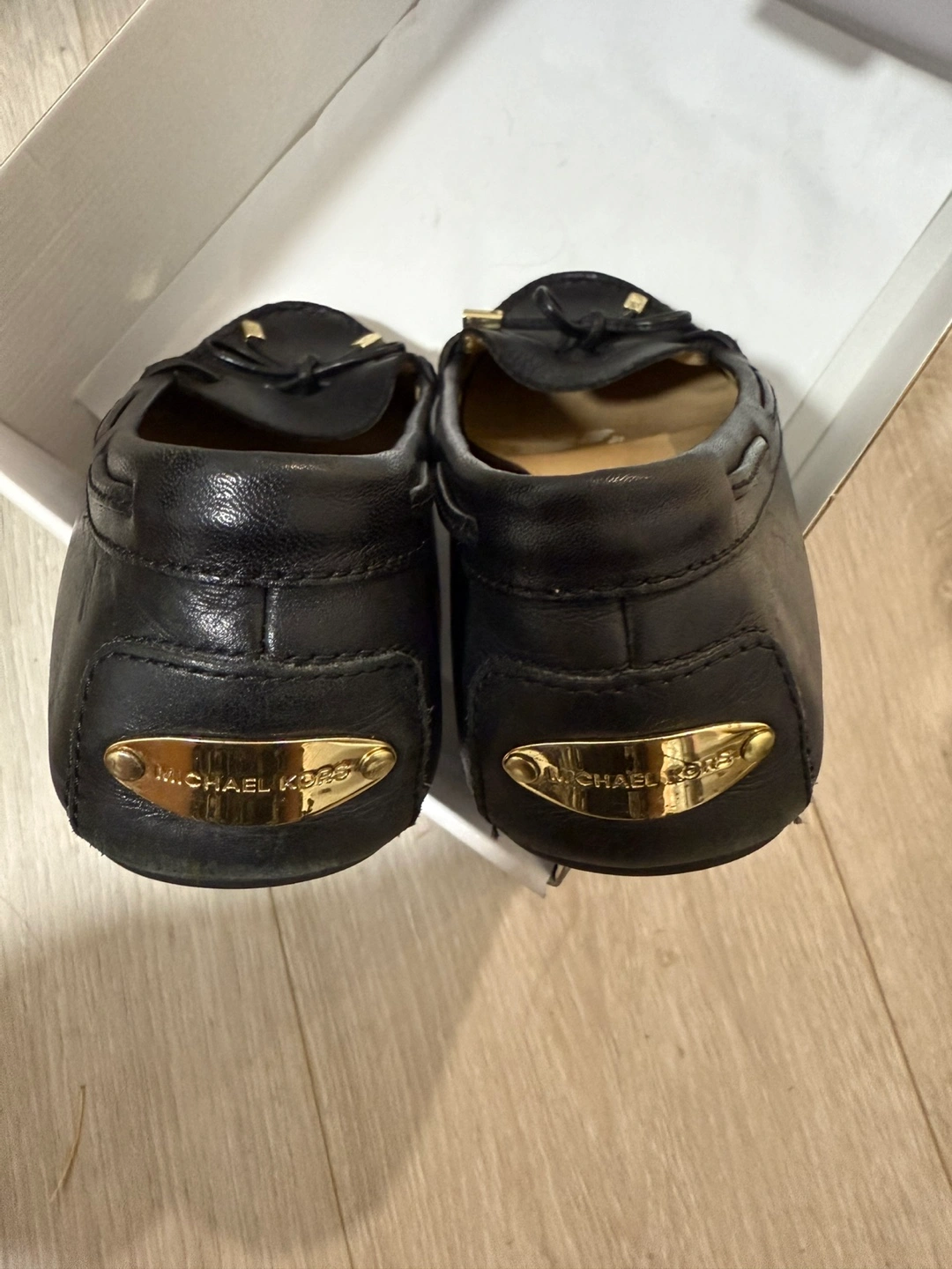 A selection of shoes for sale: - Michael Kors black leather loafers - Michael Kors pink slides, comes with box - Tory Burch flip flops - Call It Spring black heels - Black and white sneakers, comes with box