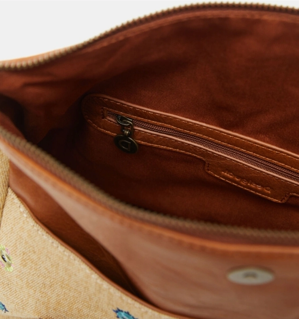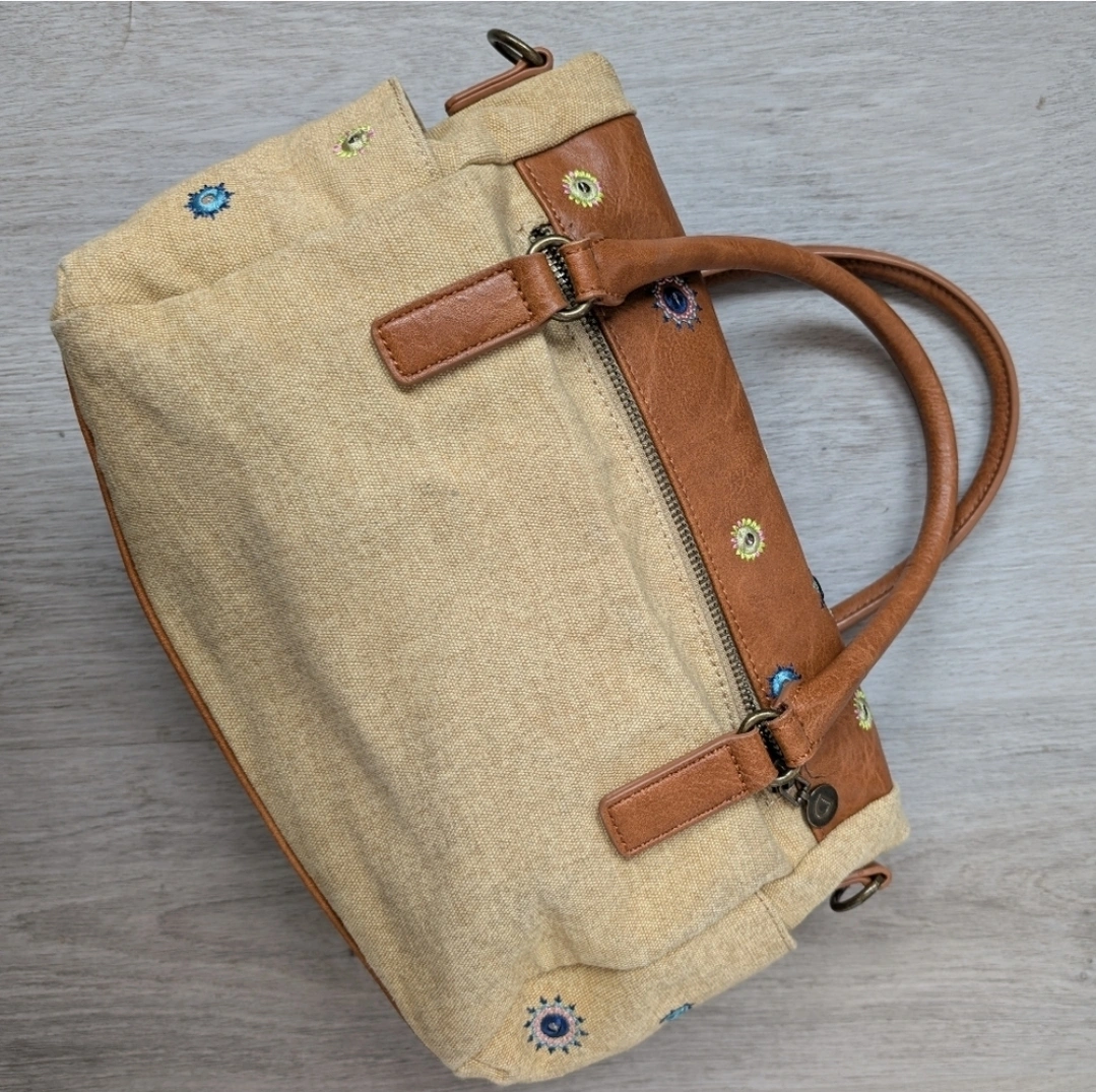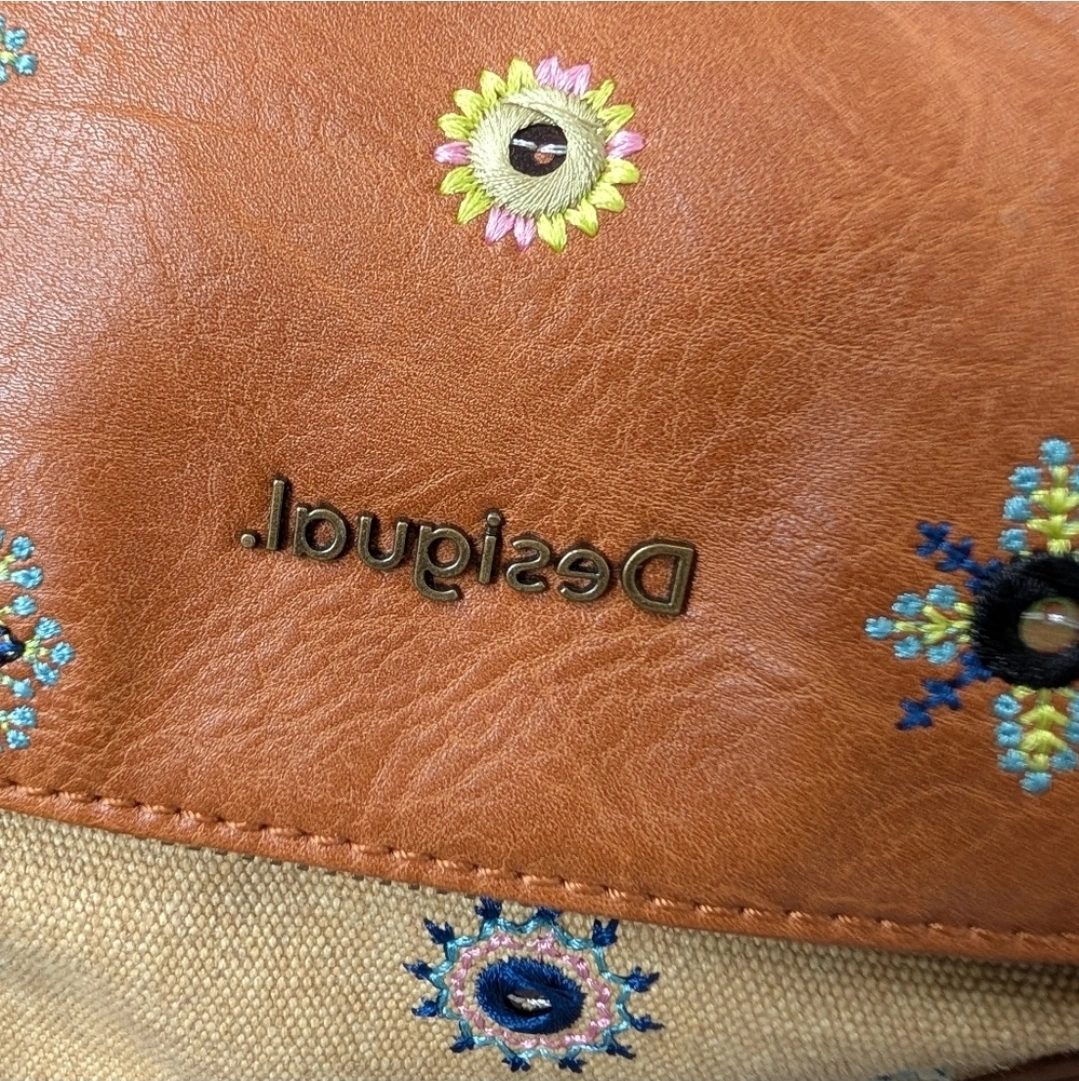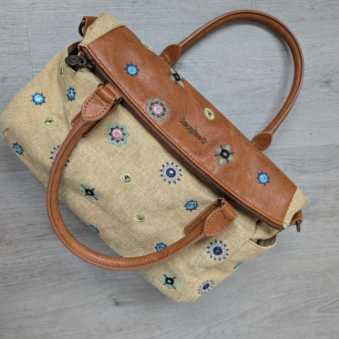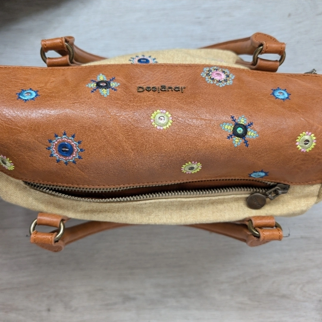 This is a lovely Desigual handbag with unique embroidery details. The bag features a combination of canvas and faux leather materials with a zippered closure. Perfect for adding a touch of flair to your outfit!