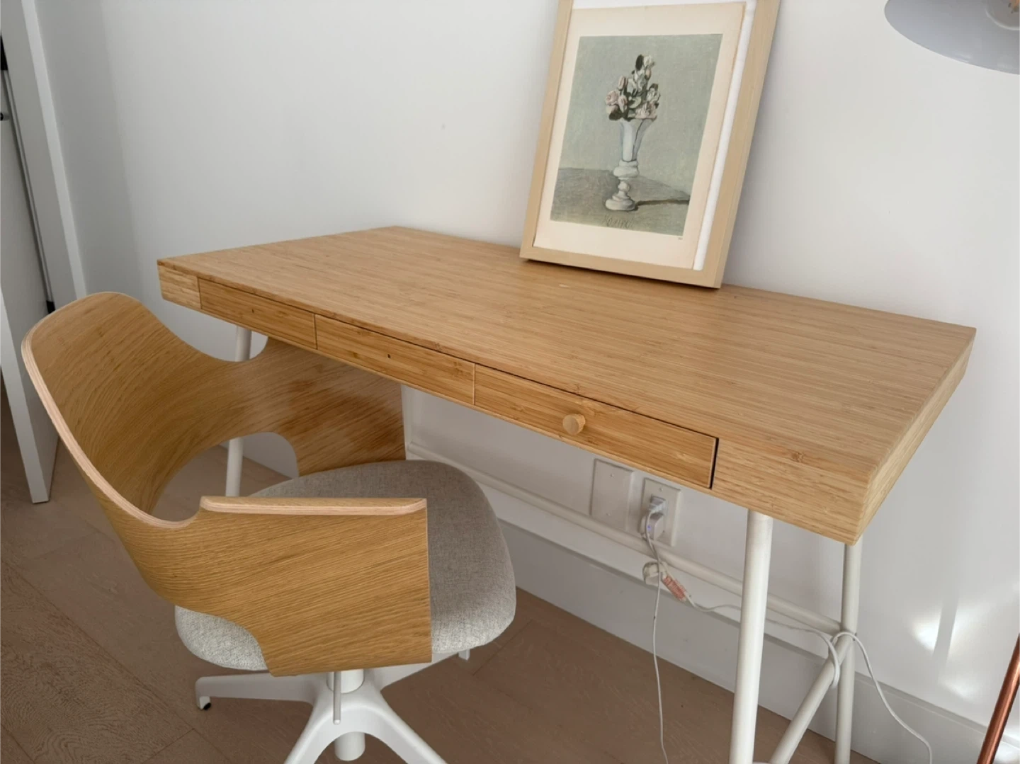 Selling a lovely desk and chair set! The desk is a light wood colour with a clean, minimalist design. It features a single drawer for storage. The chair complements the desk perfectly with its light wood frame and comfortable seat. Great for a home office or study space!
