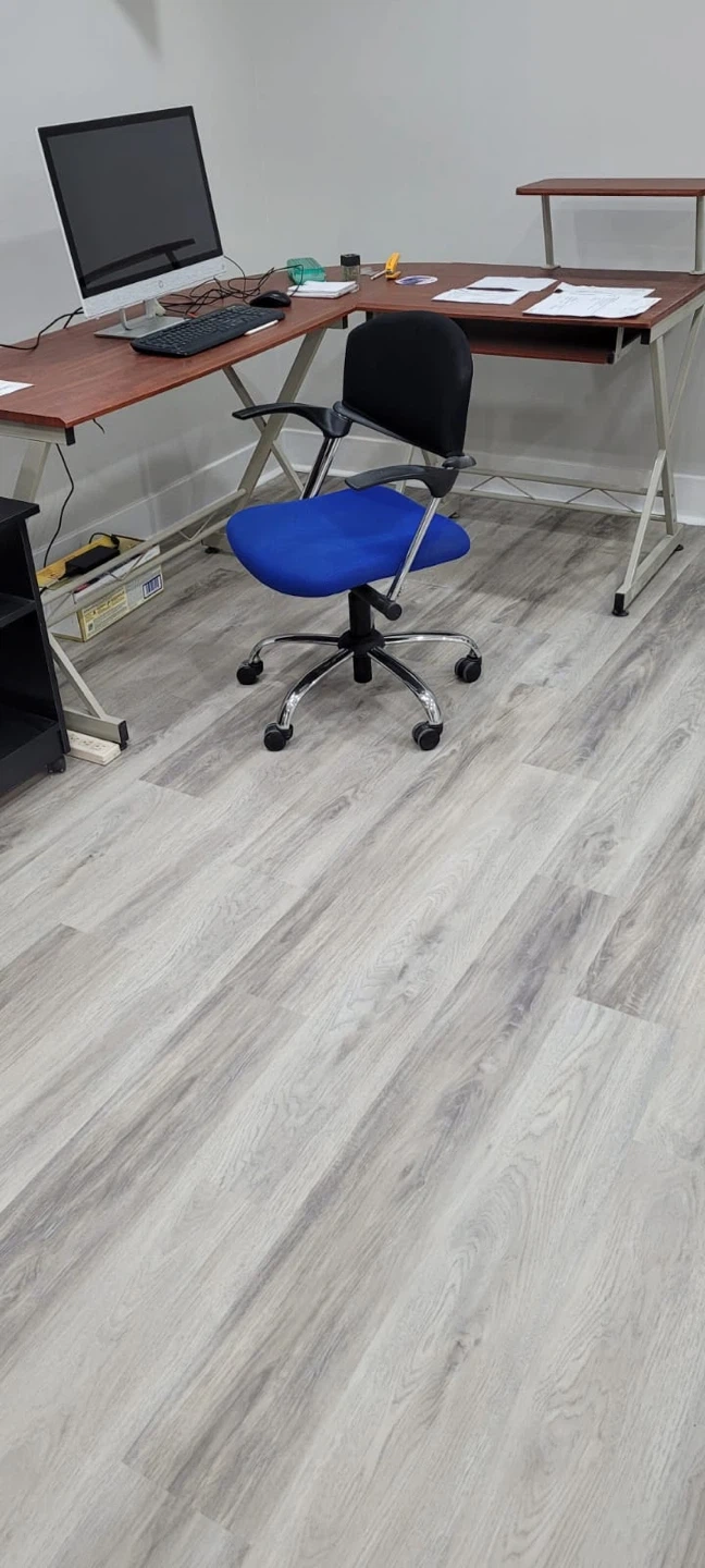 Selling a desk with a monitor and keyboard, along with a comfortable office chair. The chair is blue and black, and the desk appears to be in good condition. Great for a home office setup!