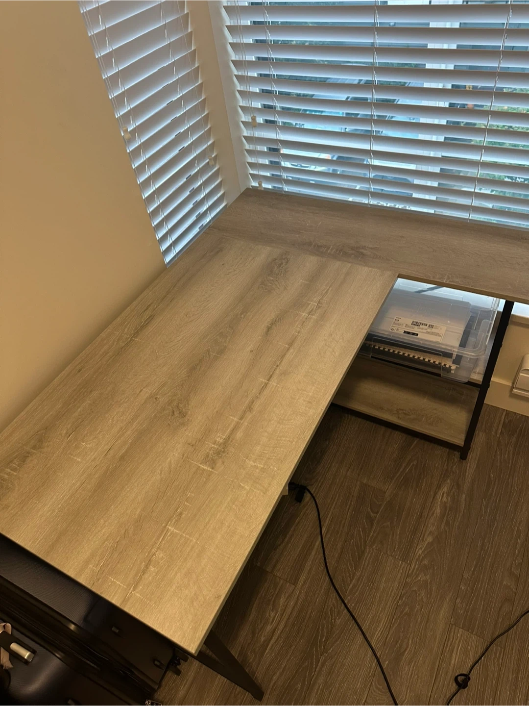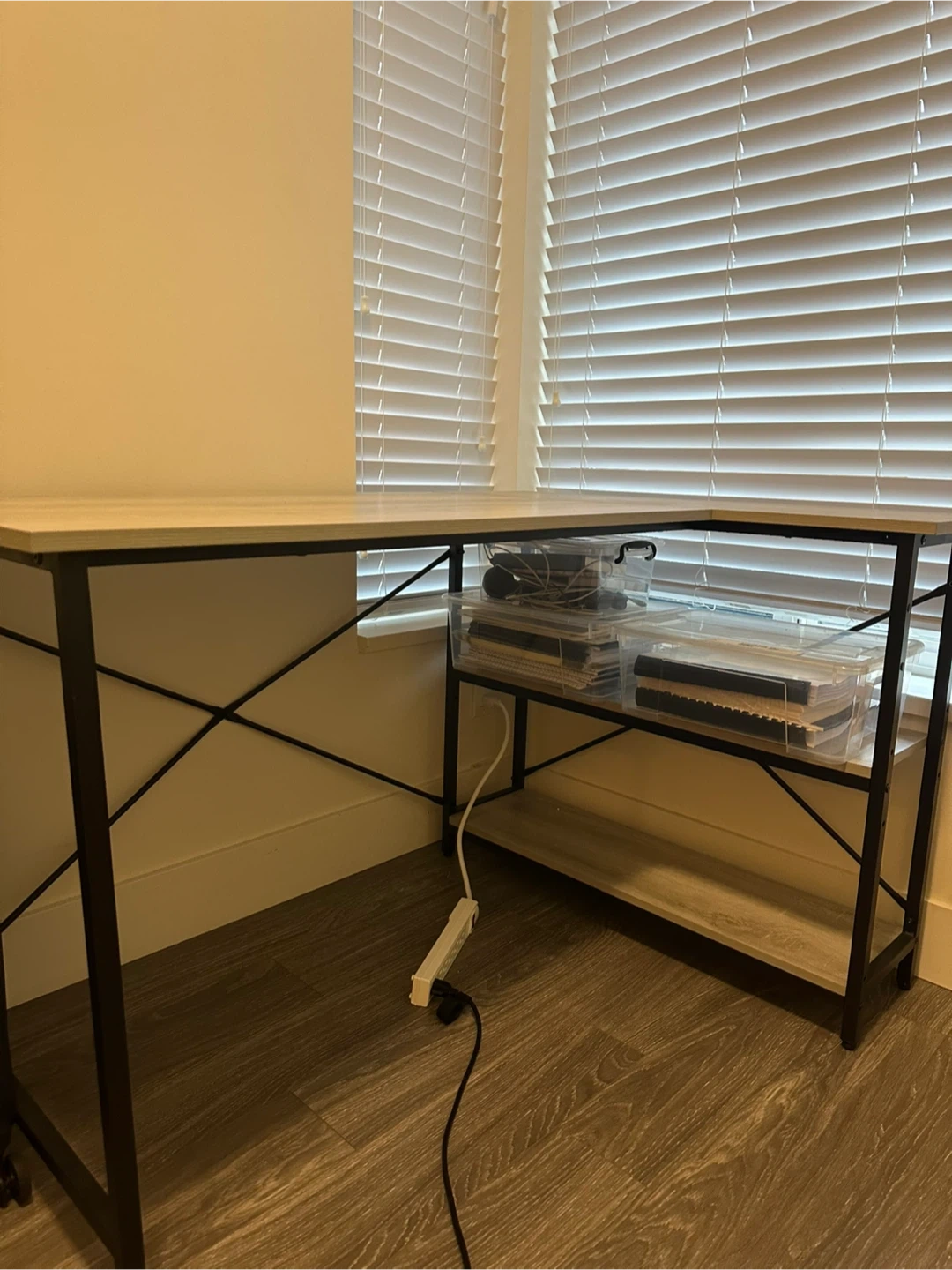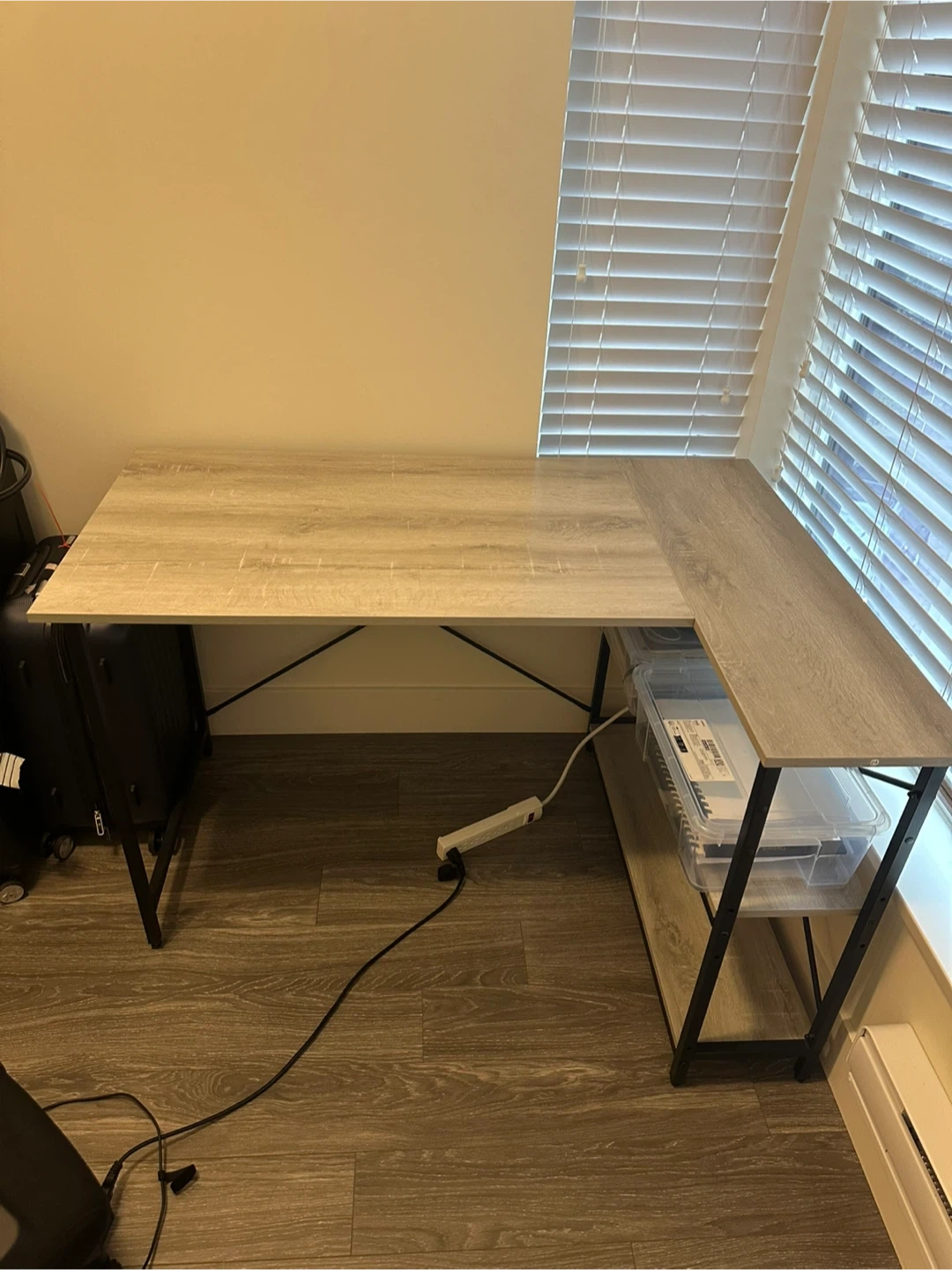 Selling a desk with built-in shelves! It's in great shape and perfect for maximizing space in a small room or apartment. The shelves provide convenient storage for books, office supplies, or decor. The desk has a light wood-look top with a black metal frame. The shelf can also be placed on the other side. 47 inches length