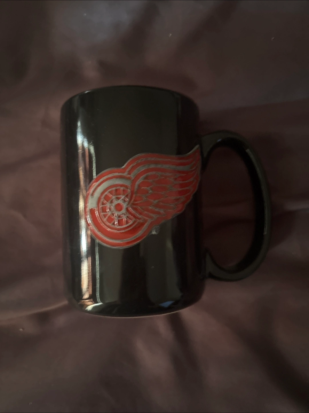 Selling a Detroit Red Wings coffee mug! It's black with the classic Red Wings logo on it. A great mug for any hockey fan!