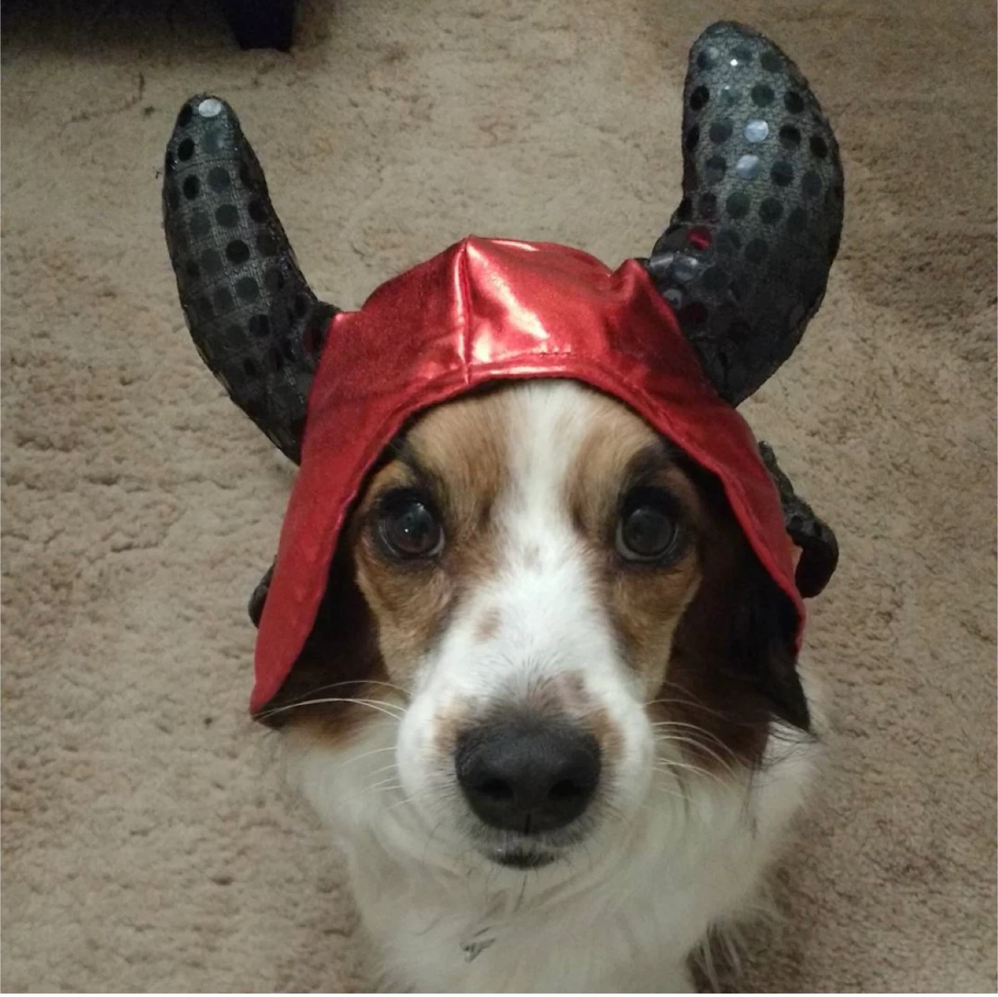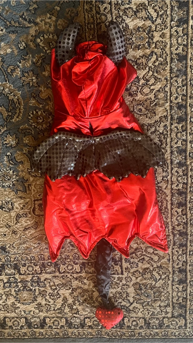 Get your furry friend ready for Halloween with this adorable devil costume! It's in great condition and perfect for small dogs or cats. The costume features a red and black design with horns, wings, and a heart-tipped tail. Your pet will be the cutest little devil on the block!