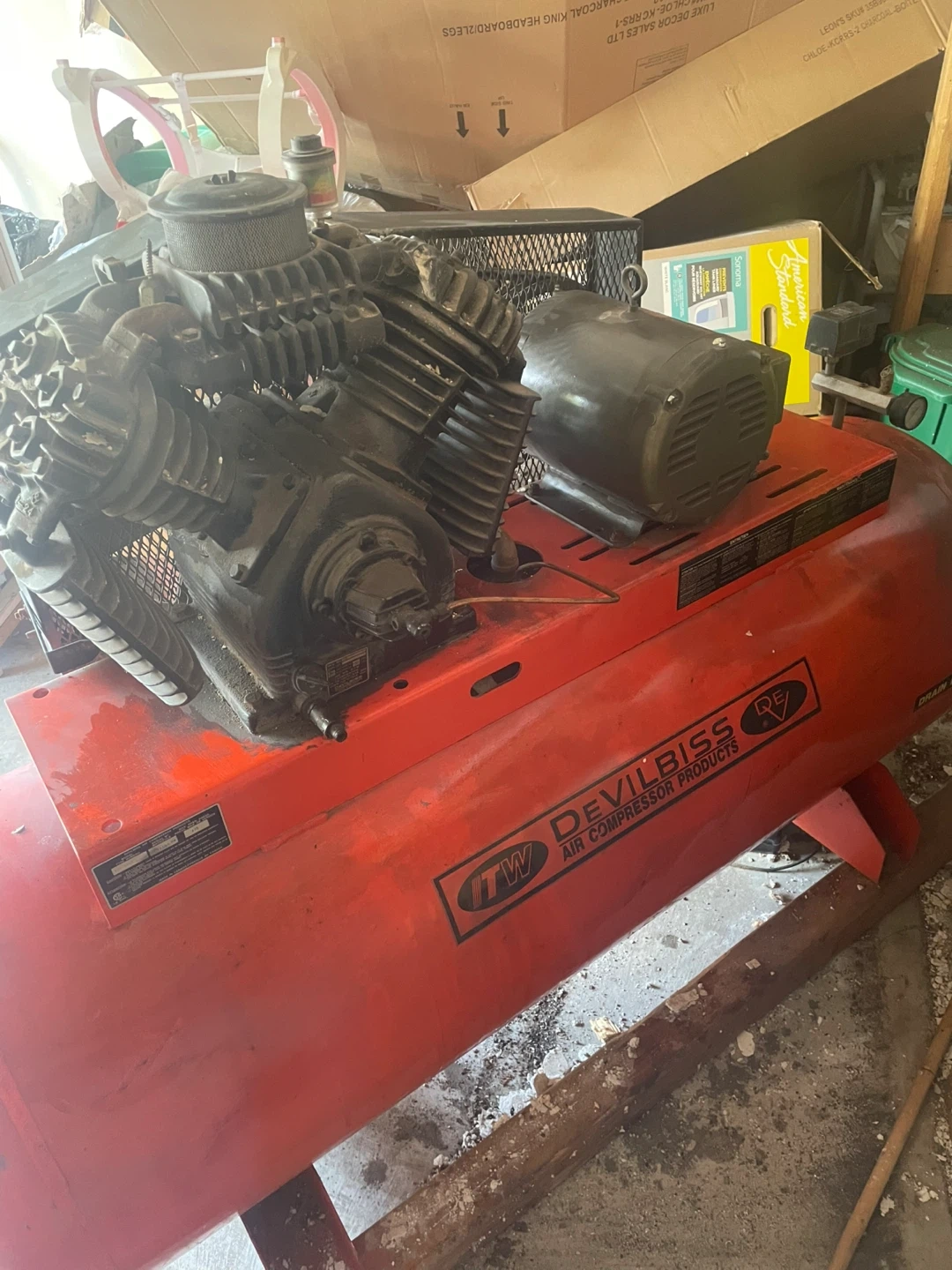 Selling a Devilbiss air compressor. It's in used condition, as shown in the photos. Great for various projects around the house or in the shop