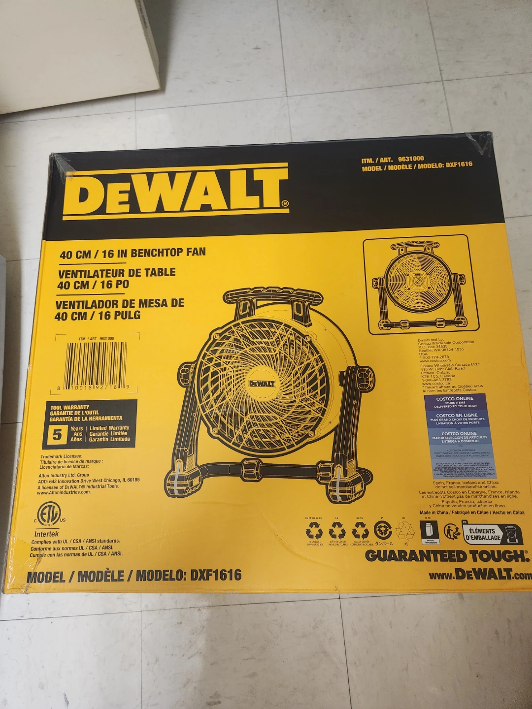 Dewalt benchtop fan. Model DXF1616. 40cm/16 inch blades. Five-year limited warranty.