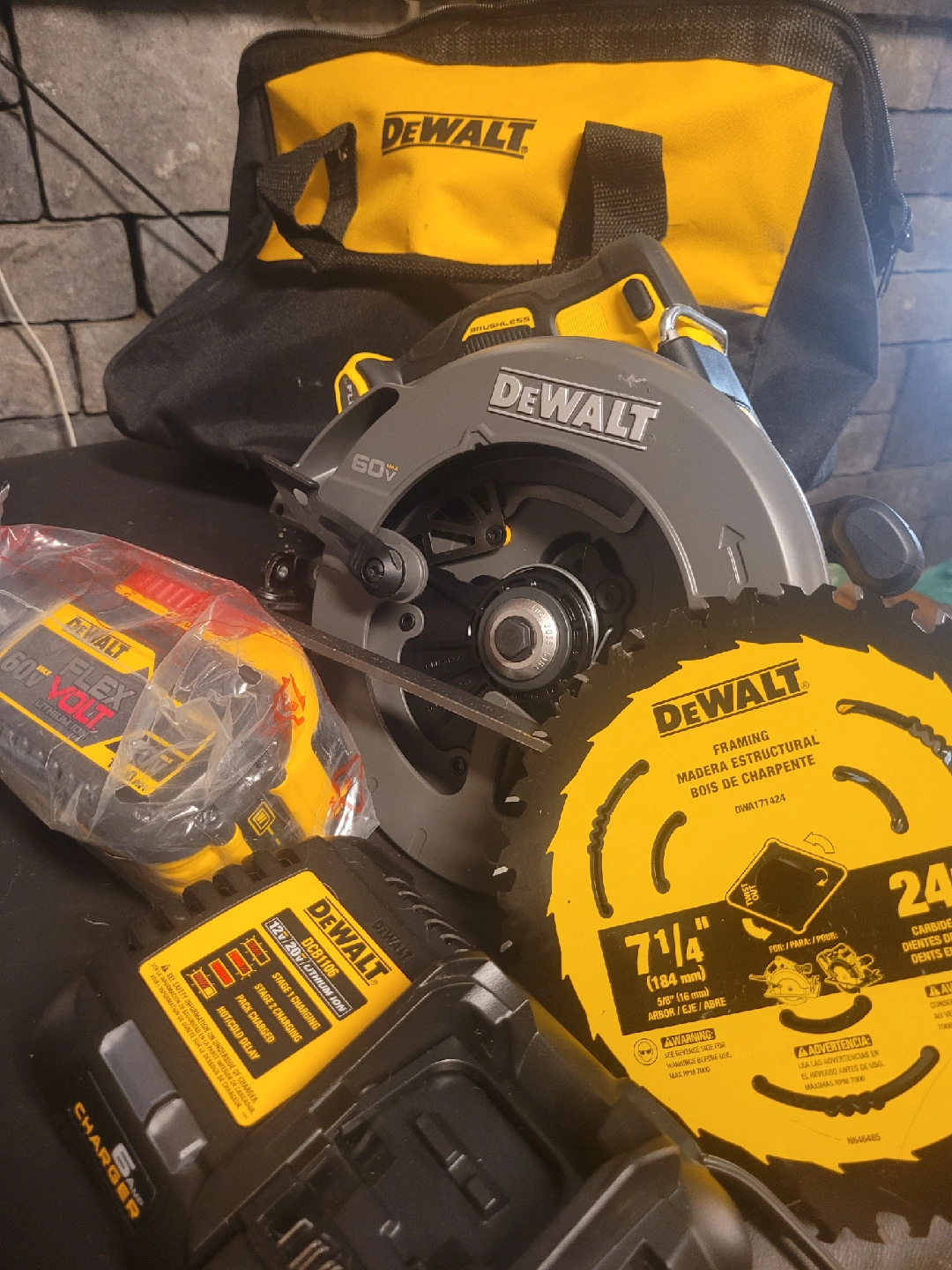 Selling a DeWalt 60V circular saw kit. It includes the saw, charger, battery, and carrying bag. The blade is 7 1/4 inches. It's perfect for framing and structural work. Ready for your next project!