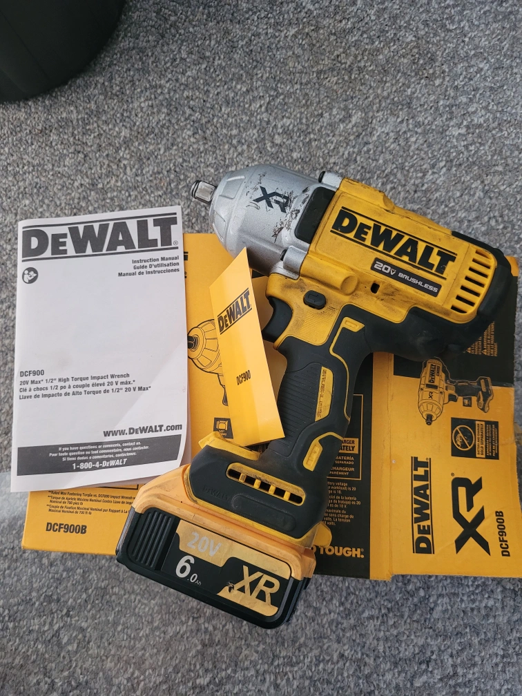 Selling a DeWalt DCF900 1/2" high torque impact wrench. It's a 20V brushless model. Comes with the instruction manual and the original box. It also includes a 6.0Ah 20V XR battery and charger. will include an extra battery for another 40$