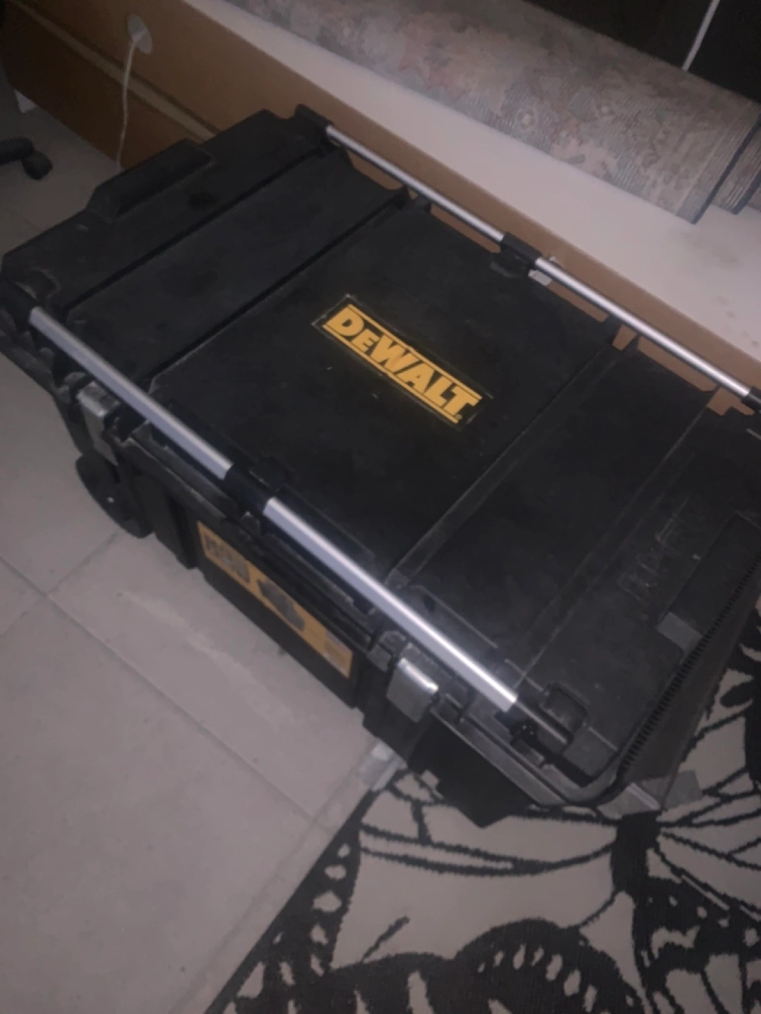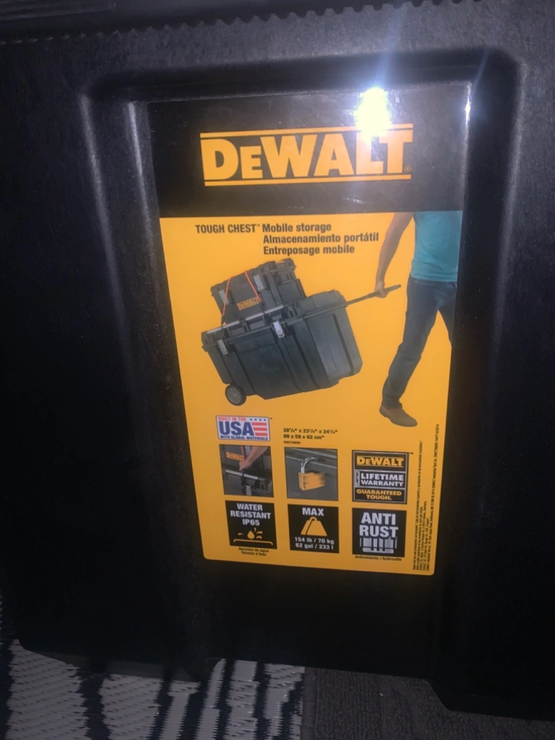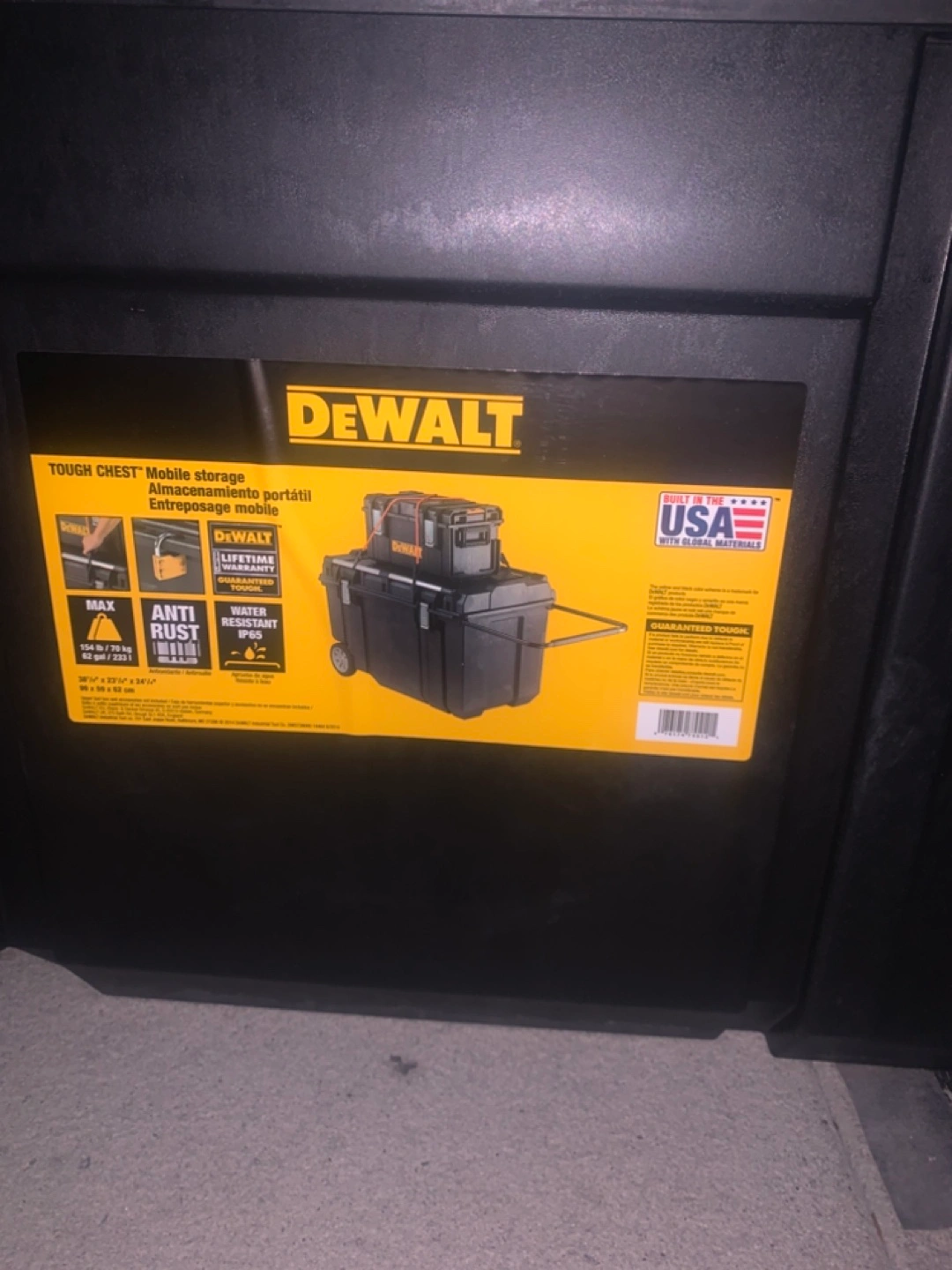 Large black plastic storage container. Wheels and a handle for easy transport. Water resistant and anti-rust. Durable and spacious. Largest of the available storage containers in the dewalt family. It was purchased back in sept of last year and has been used for the storage of clothing and food items and still in exceptional condition.