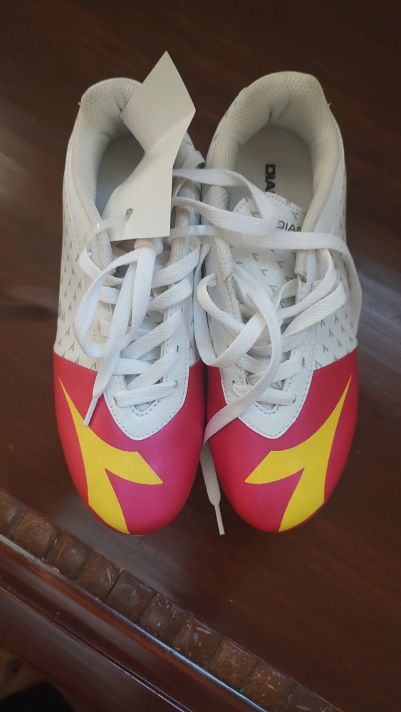 White soccer cleats. Feature red and yellow accents. A nice way to feel grounded.