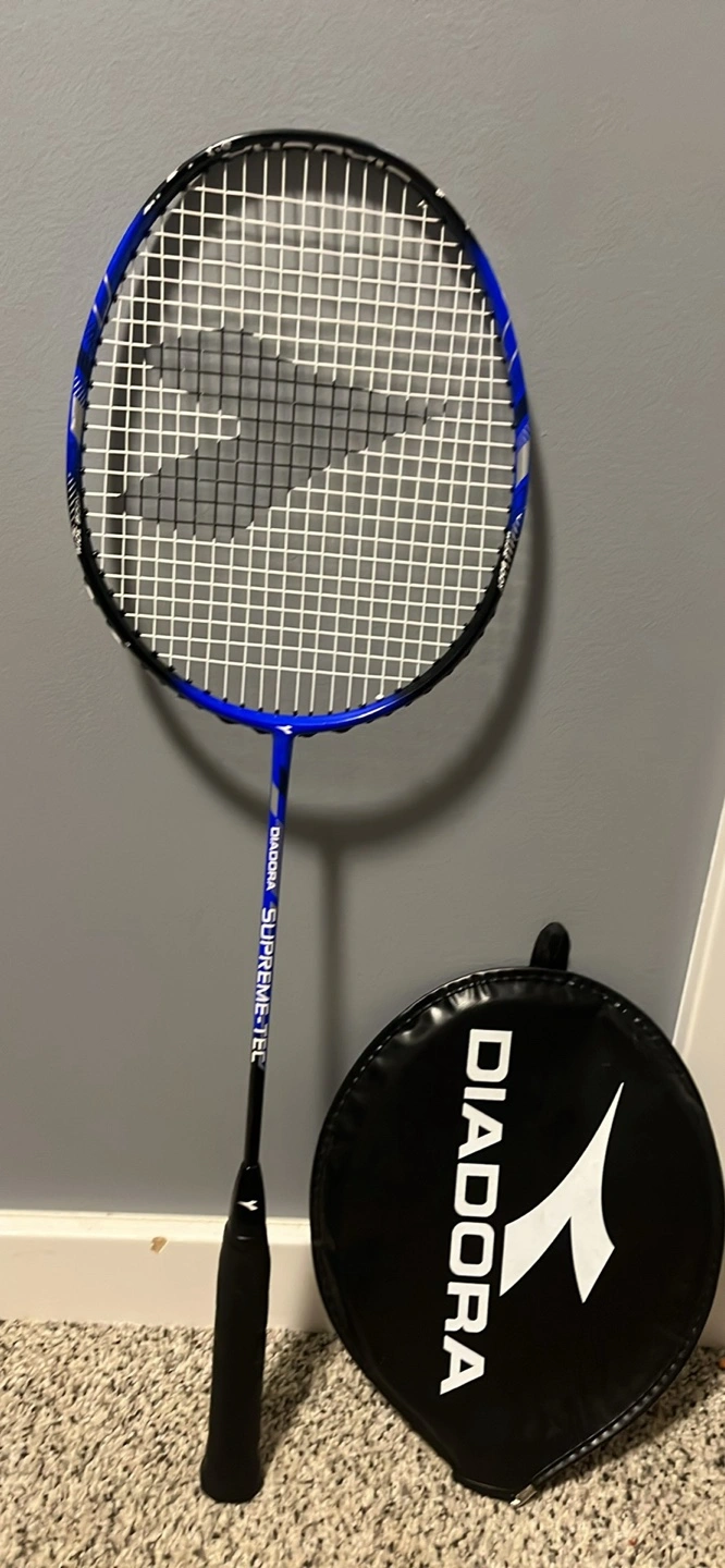 A badminton racket, featuring a white net and a blue and black frame. It also comes with a black case. You can use this for a relaxing afternoon playing badminton with a friend.