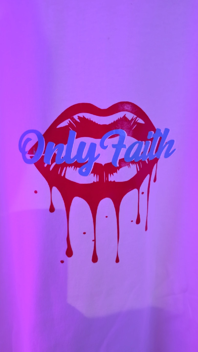 Selling a few graphic t-shirts. One has a diamond design, another has the words 'Only Faith' with lips, and the last one has a KAWS-inspired design. Great for casual wear!