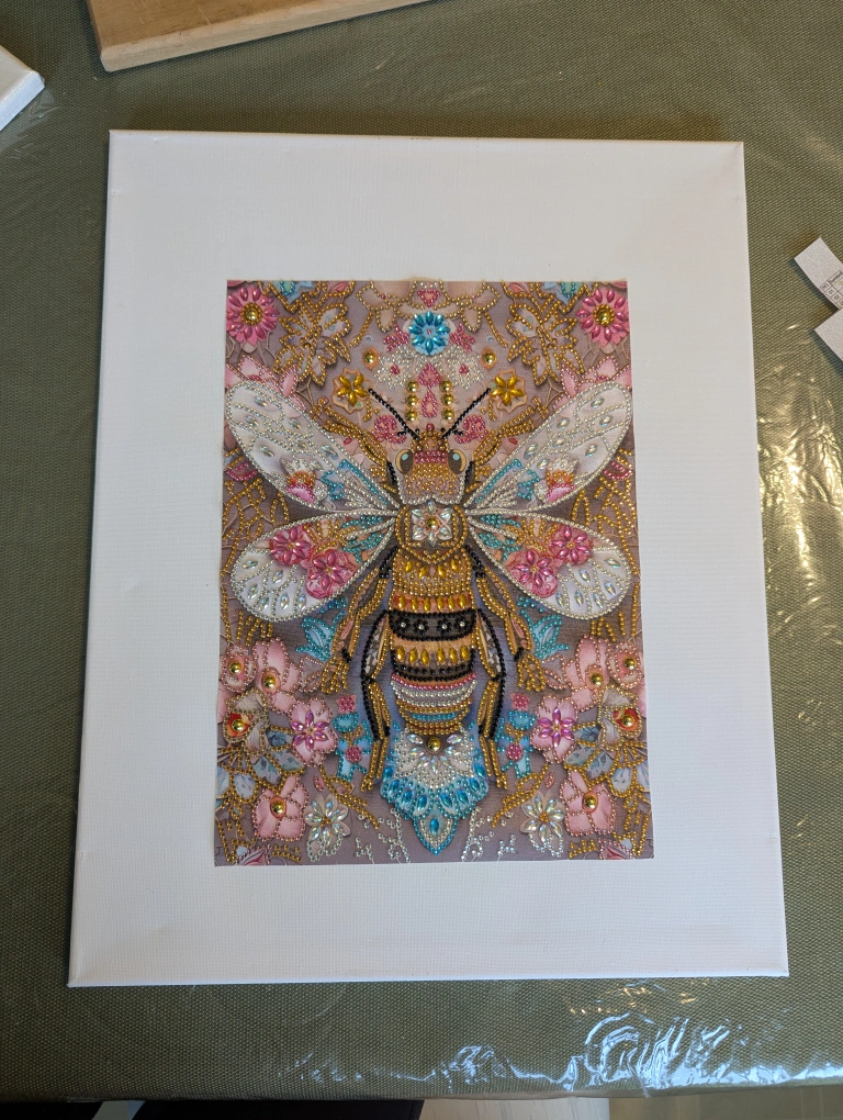 Show allFinished diamond painting. Depicts a bee amongst flowers. Mounted on a white canvas. Ready to hang. 40cmx30cm