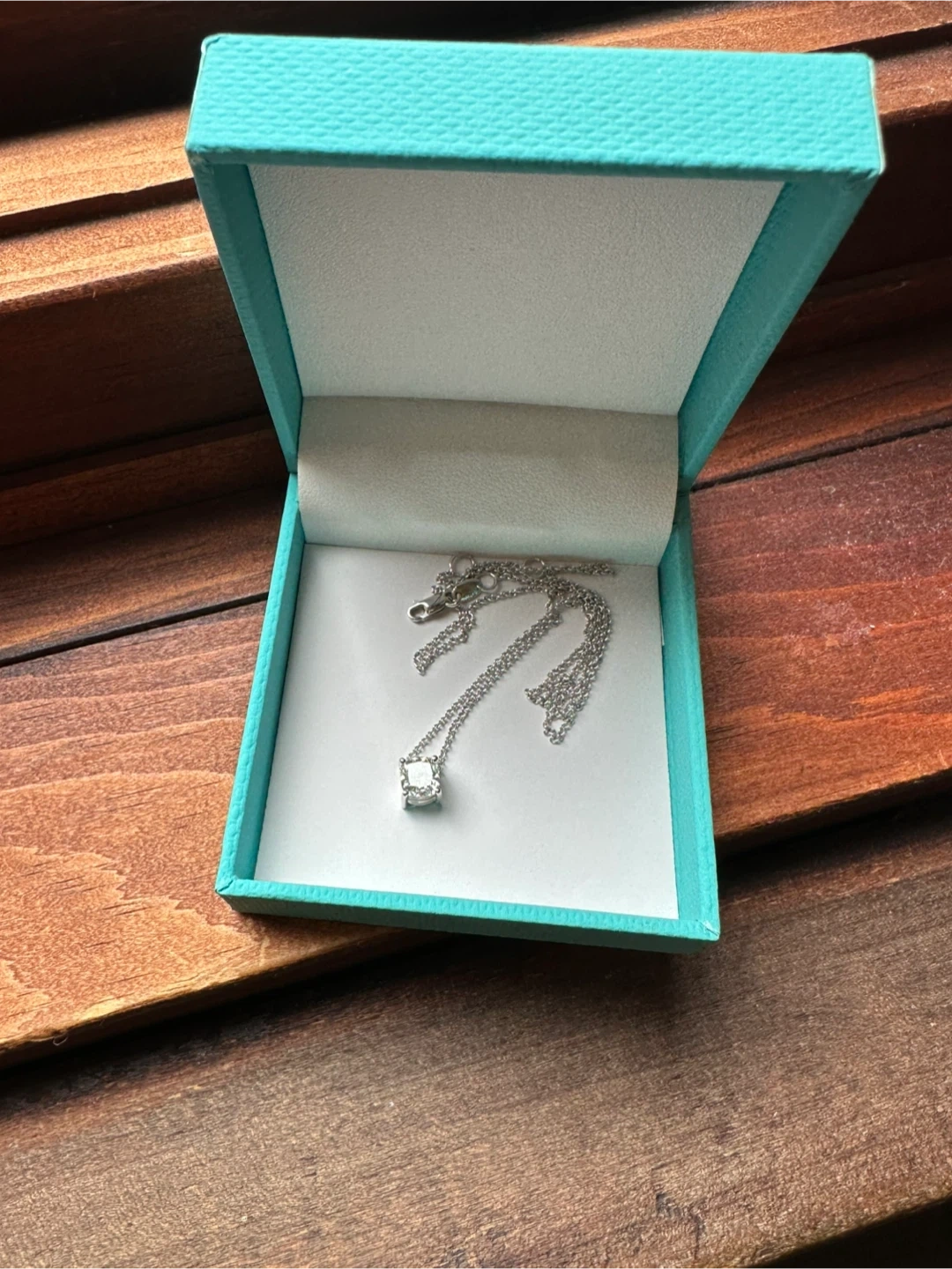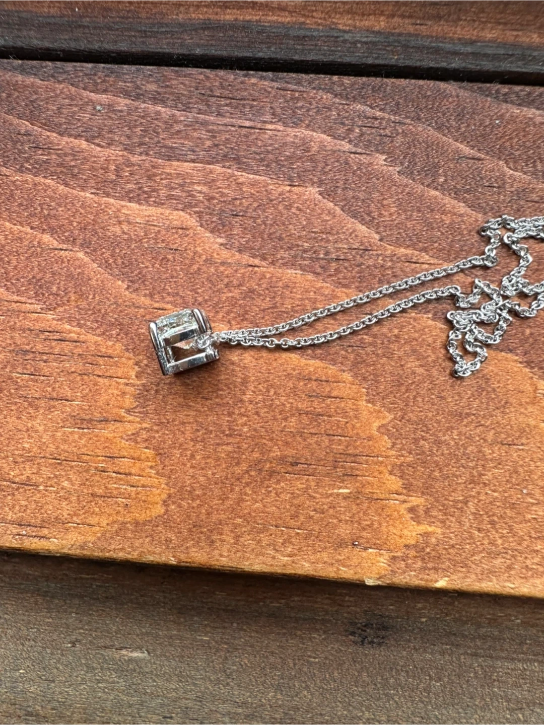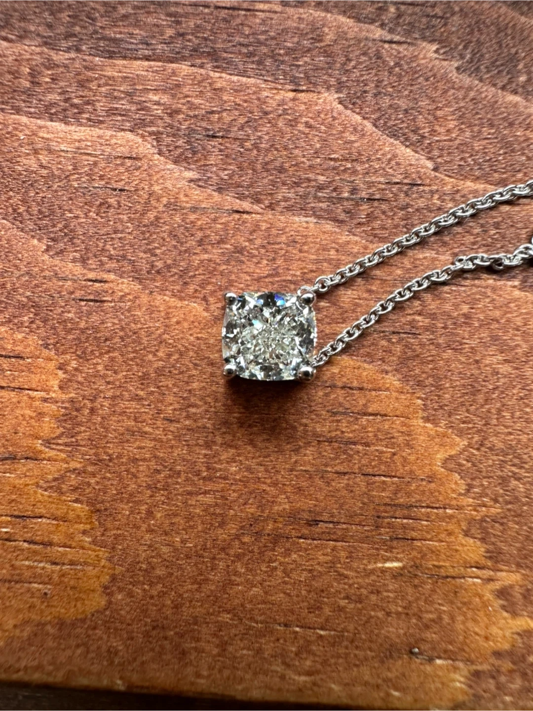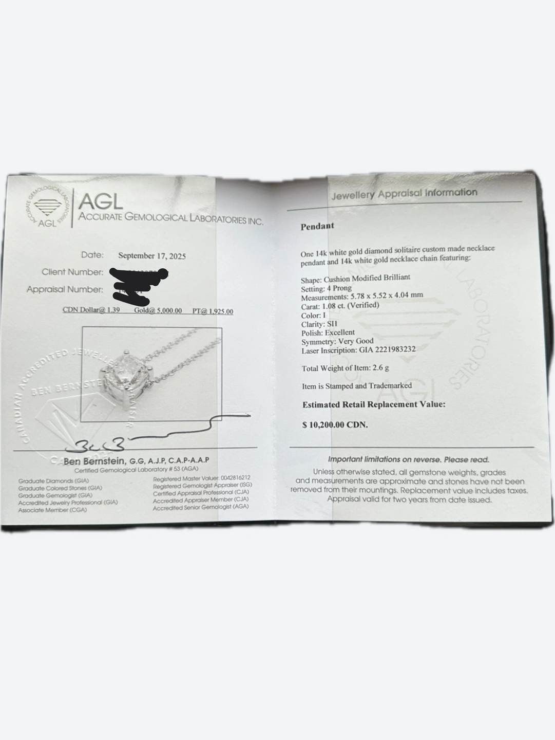 Classic, timeless, elegant natural real diamond necklace. Cushion cut natural diamond floating solitaire pendant set in white gold. Diamond has its own GIA certificate and necklace has an AGL appraisal. Cushion cut modified brilliant diamond measuring 5.78 x 5.52 x 4.04 mm. It is 1.08 carats, I color SI1 clarity. Excellent polish, very good symmetry. 62% x 73.2%. No fluorescence. The necklace is 16" and weighs 2.6 g. It's a custom made brand new piece, never been worn. Appraisal came back at $10,200 CAD this month.
