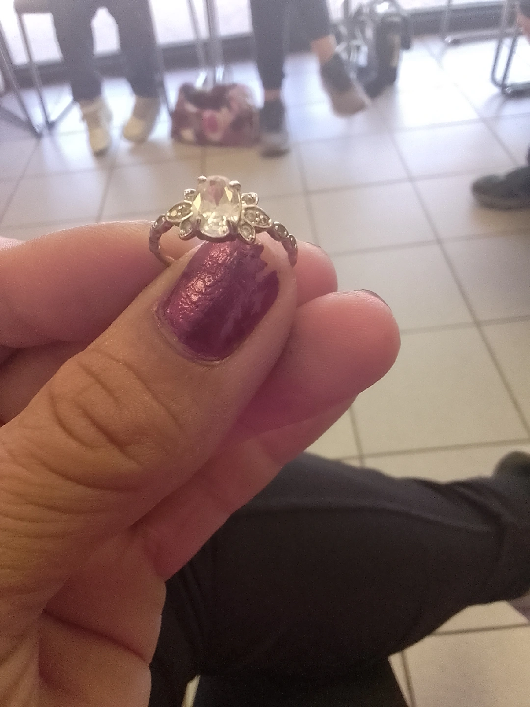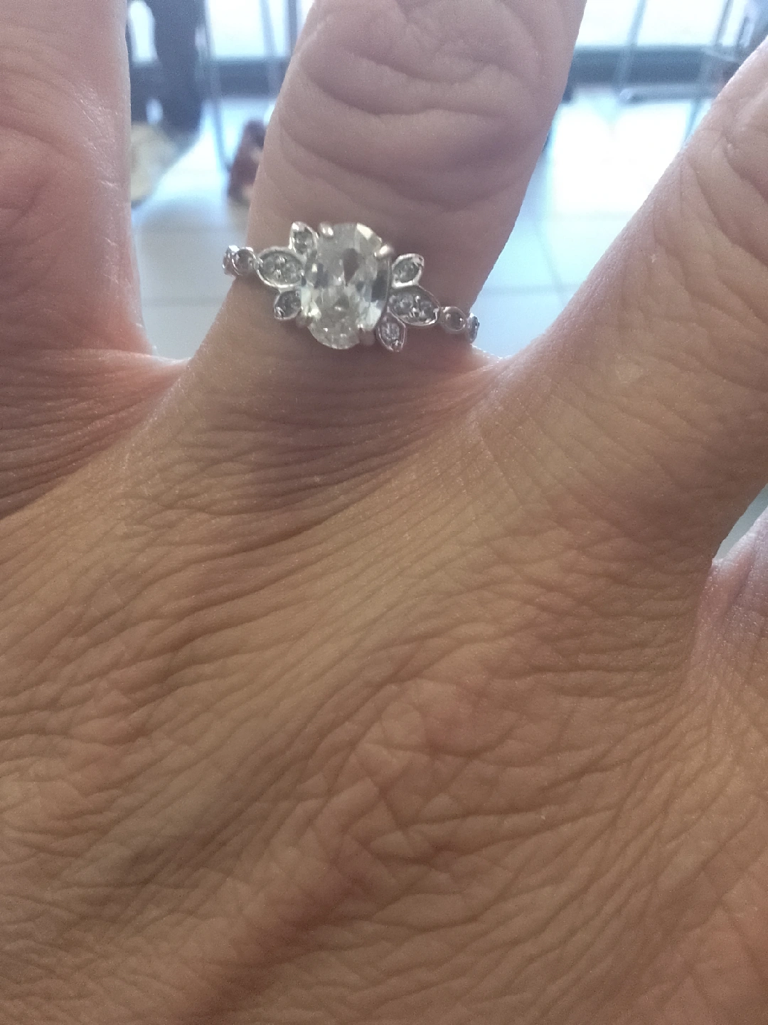 Selling a beautiful diamond ring. It features an oval-cut diamond set in a floral design. It's in great condition and ready to be loved by someone new