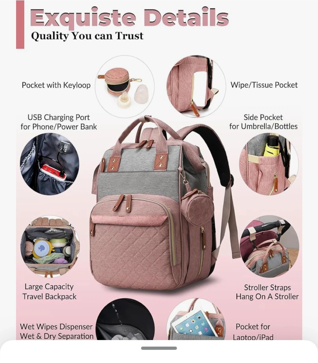 Keep your everyday essentials organized with this diaper bag! It has a large capacity and lots of pockets to keep everything in its place. It also has a USB charging port for your phone or power bank, stroller straps to hang on a stroller, and a pocket for your laptop or iPad , generally used for few times Still like new and clean.