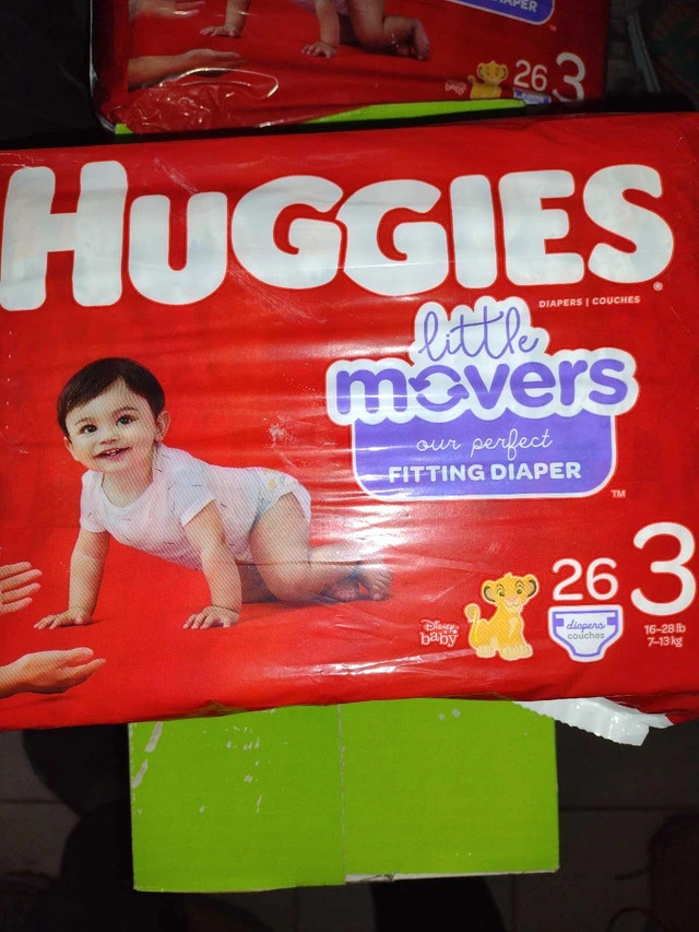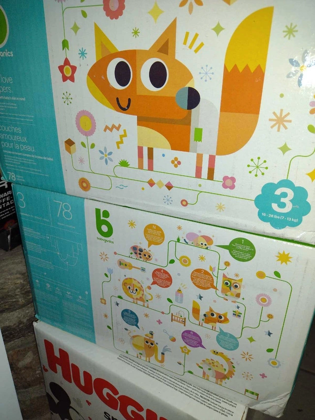 Huggies size 6 $20 (62 qty) Huggies Little Movers size 3 (26qty) X2 $10 each Babyganics size 3 $20 (78 qty)