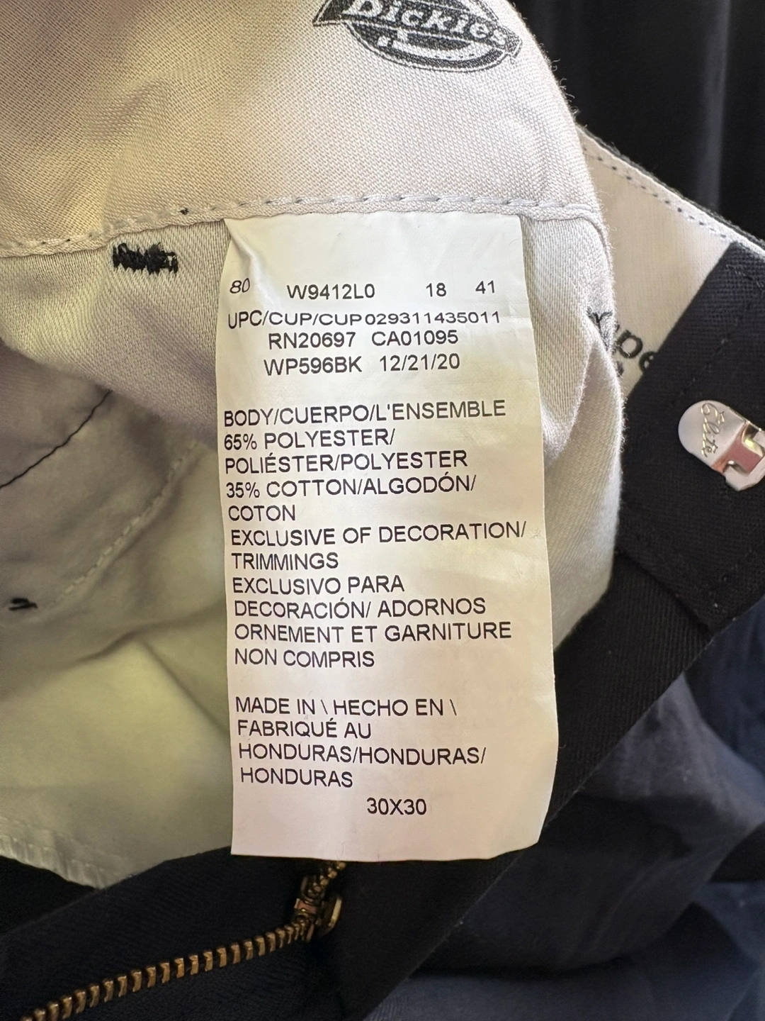 Like new Men's Dickies work pants. Slim taper fit. Black colour. 65% polyester, 35% cotton blend. Size 30x30. Good condition $3 Pick up Victoria park & O’Connor area