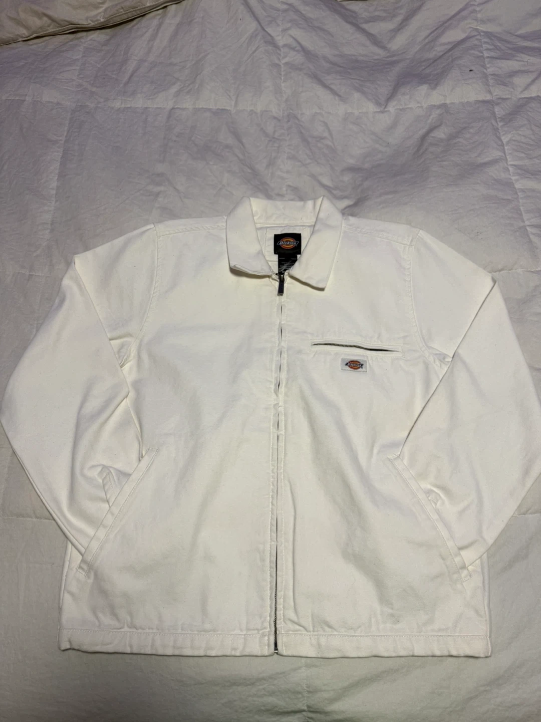 Selling a Dickies jacket in white. It's a zip-up style with a classic look. Perfect for layering or wearing on its own!