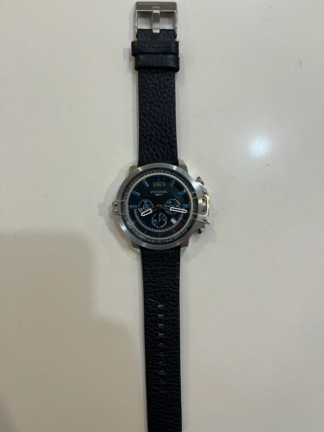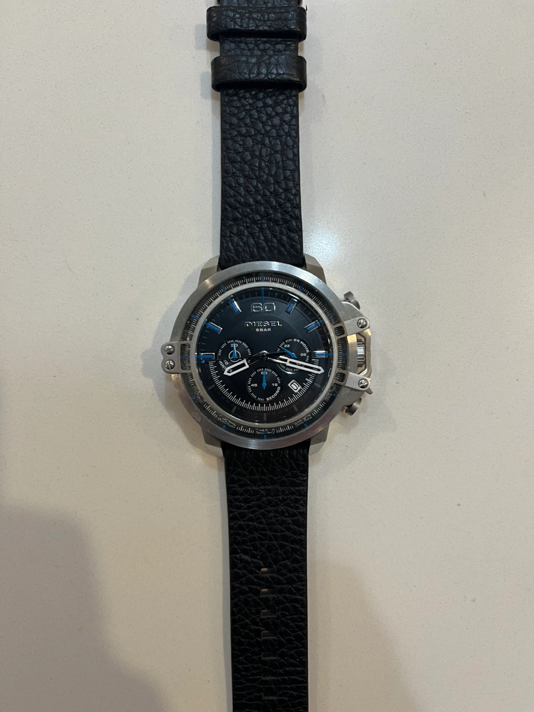 Diesel watch with a black leather band. The watch face has a blue and black design with multiple dials. It's in great condition and ready for a new home!