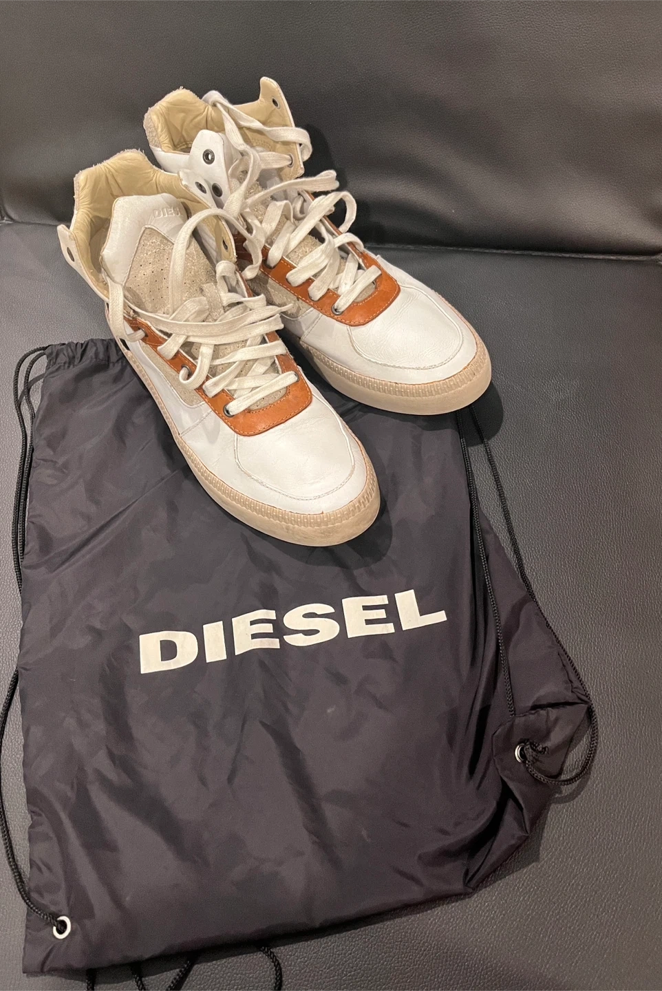 Leather and suede upper Diesel high top sneakers, man made sole, They are in EU size 44, which is a US size 10.5. Comes with the original Diesel dust bag