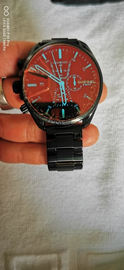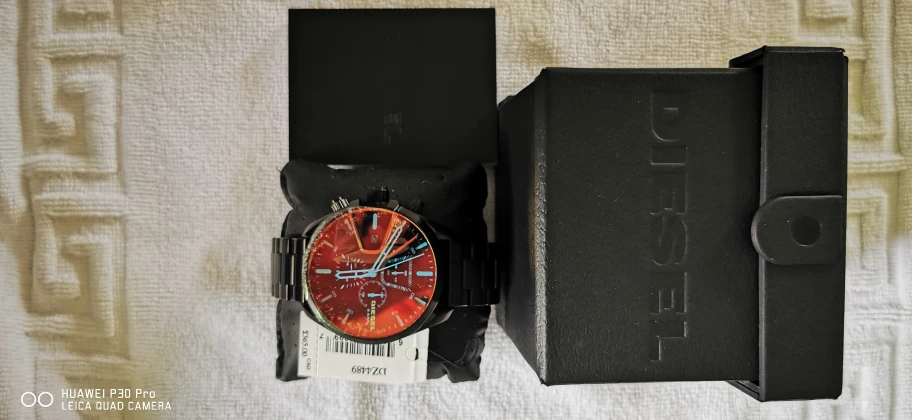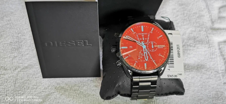 A men's Diesel watch with a black band and a red face. It comes in a black box and booklet, brandnew never use