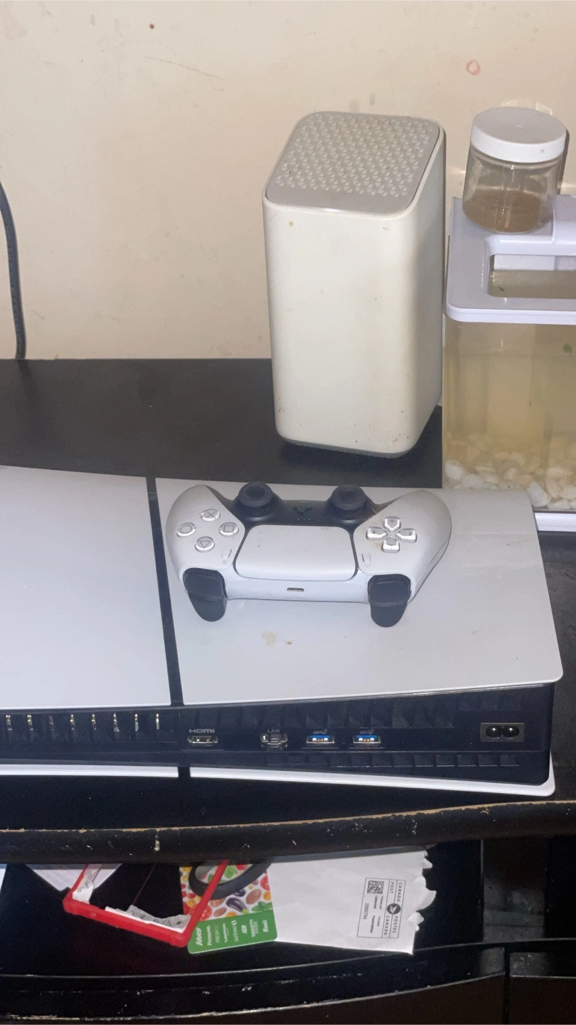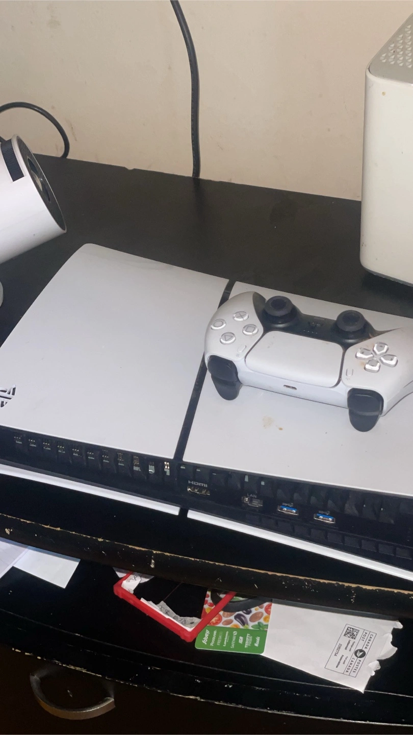 Console and controller included. White colour. The design is sleek and modern, perfect for a gaming setup. Take a moment to relax with some games.