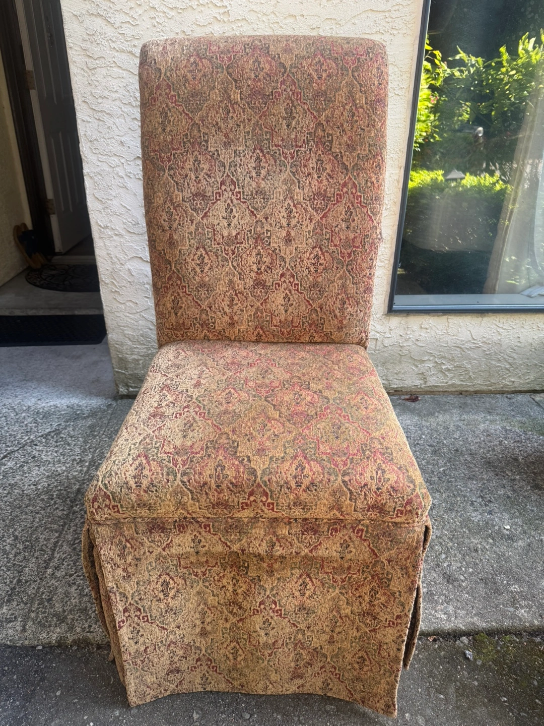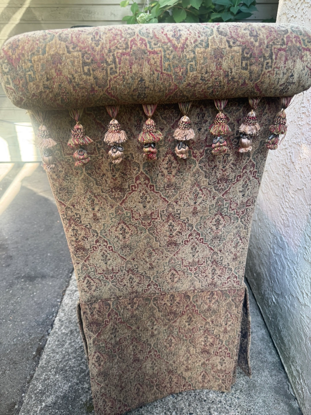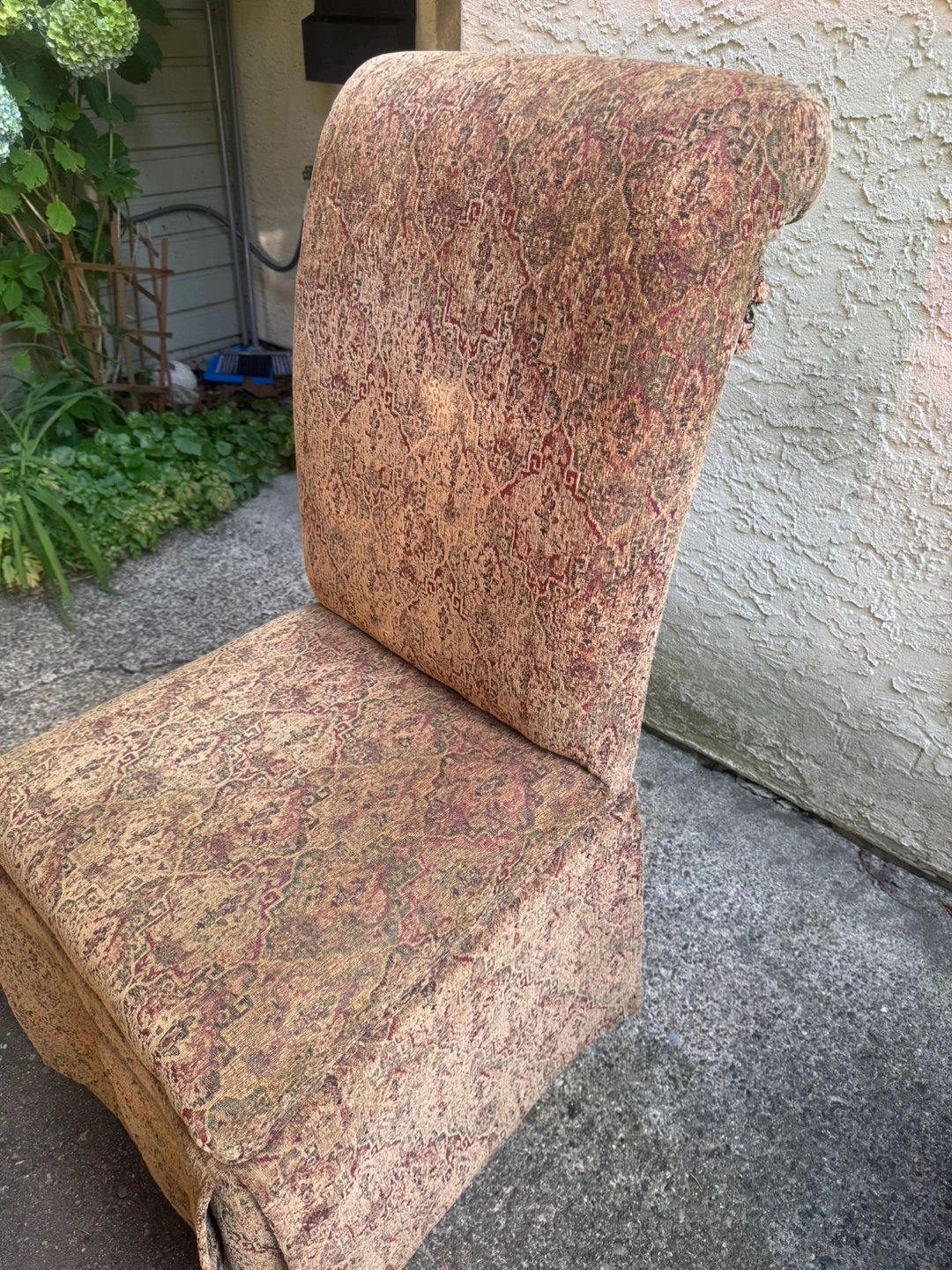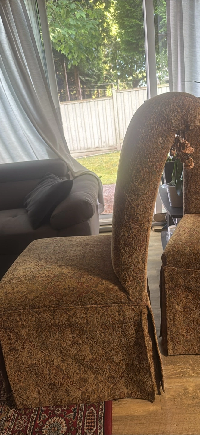 Selling dining chairs with a unique upholstered pattern. It's in good condition and would be a great addition to any dining room or living space. The chairs features a distinctive design with tassels.