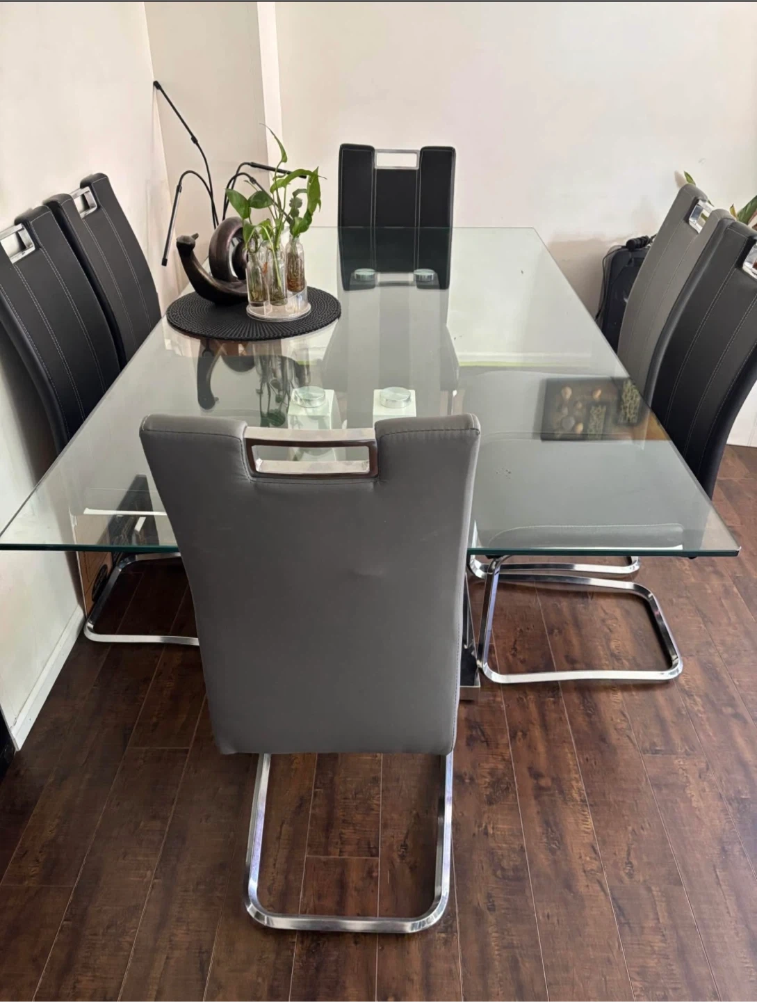 Selling a set of six dining chairs. They are a sleek black and grey colour, with a modern design. The chairs feature a comfortable seat and a stylish metal frame. They would look great in any dining room!