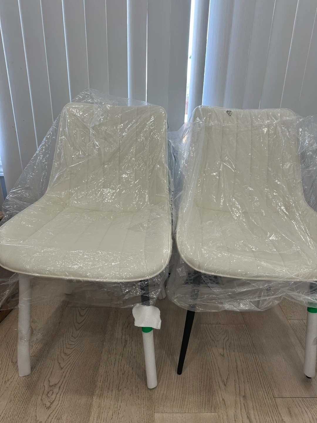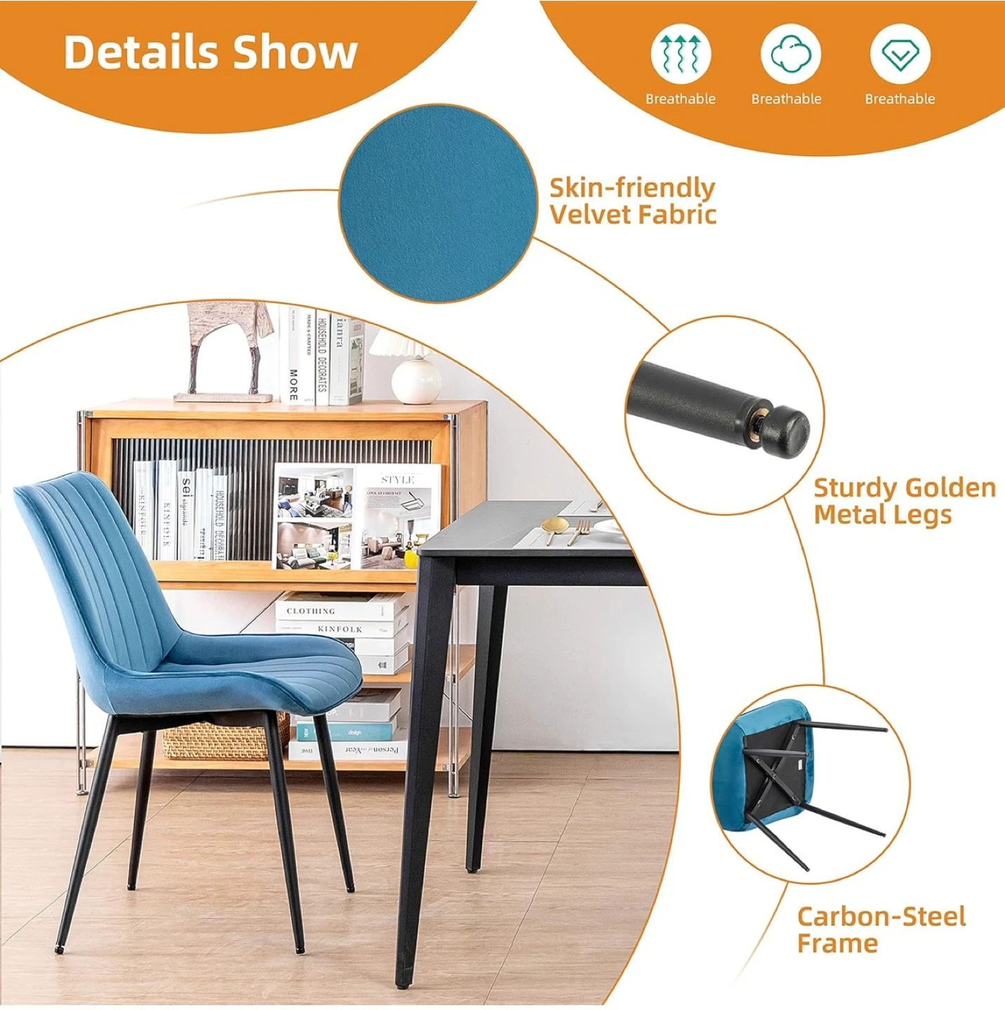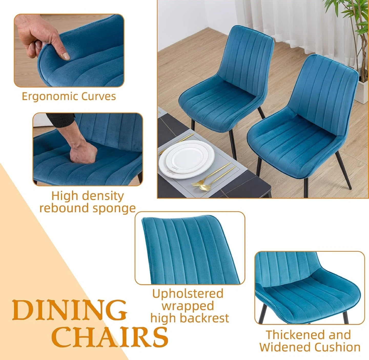 Selling a set of two dining chairs. They feature a teal blue velvet upholstery and black metal legs. The chairs have ergonomic curves and high-density rebound sponge for comfort. The seats are thickened and widened for extra support. Perfect for adding a pop of colour to your dining space!