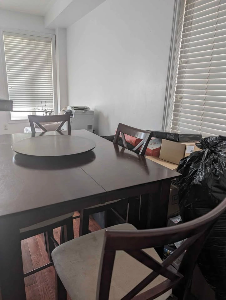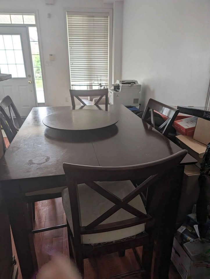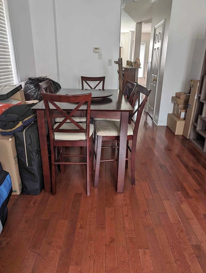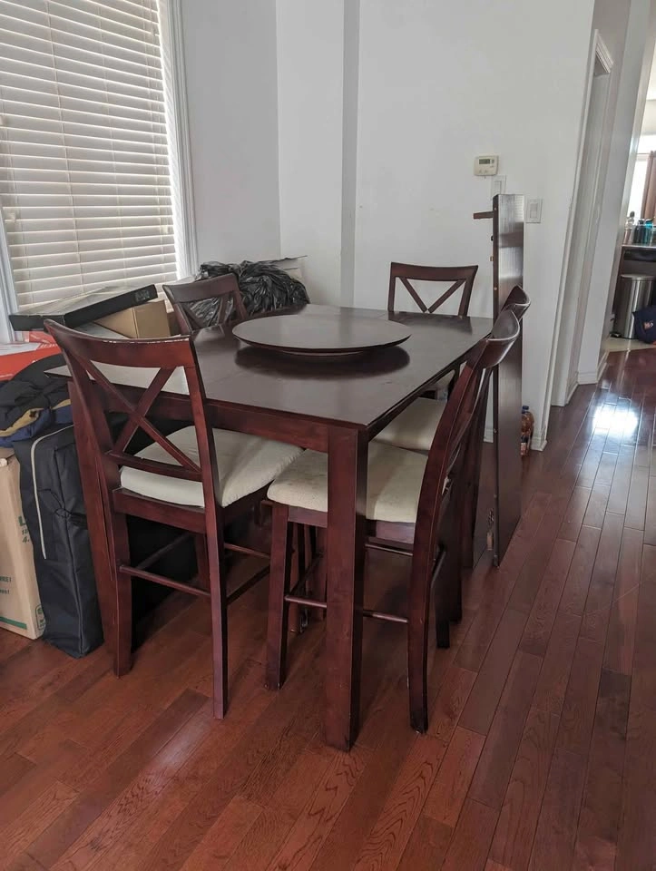 Great condition to furnish a basement and/or apartment. Pick up only. Have had this table for a long time, but barely used it. Recently just got the seats cleaned. Some markings on the top of the table and paint one leg that I am sure can be removed. I have two new chairs still in the boxes to include in the sale.