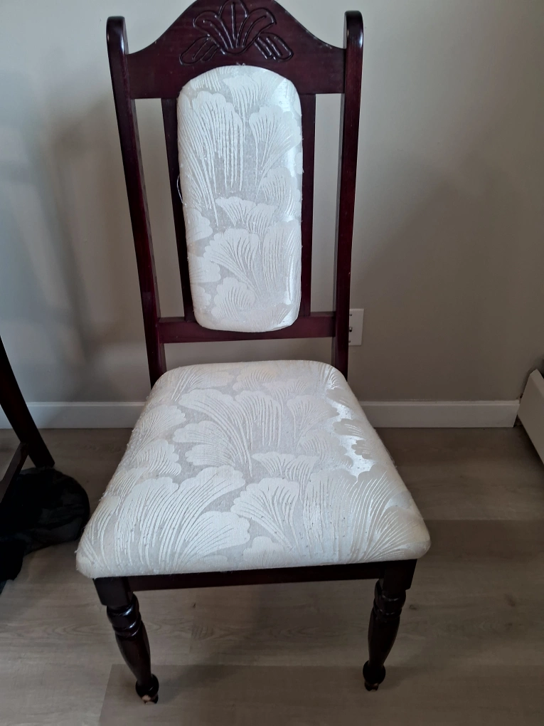 Selling a dining room chair with a dark wood frame and a floral fabric seat and back. It's in good used condition and would be a nice addition to any dining set! The chair has a classic design with a decorative top.