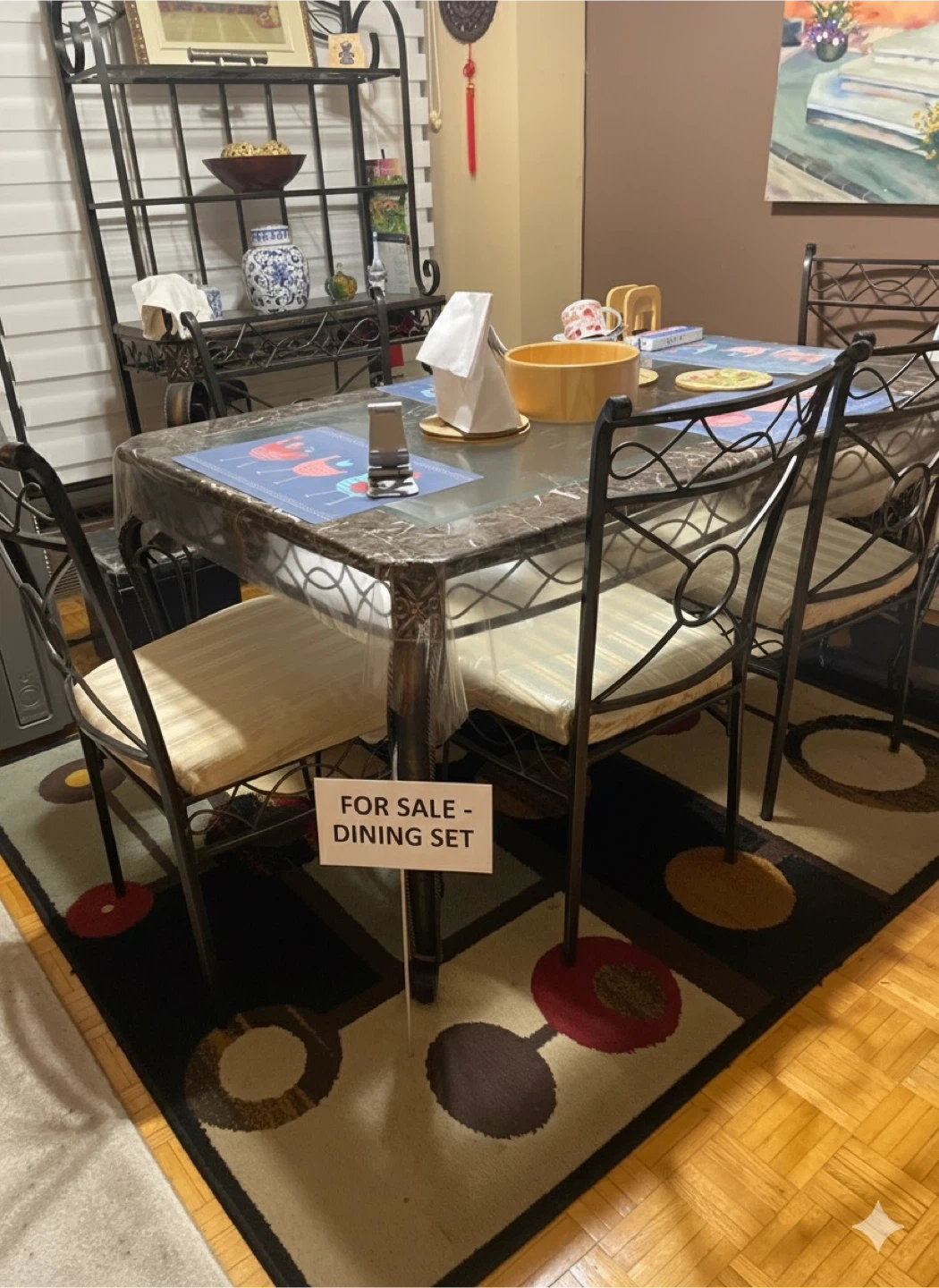 This elegant dining set, perfect for any home, features a sturdy table with a sleek, easy-to-clean surface and Sixth comfortable chairs with padded seats and decorative metal frames. Its classic design complements a variety of decor styles, making it an ideal choice for family meals or entertaining guests. Excellent condition, ready for its new home!"" Price: $200-$400