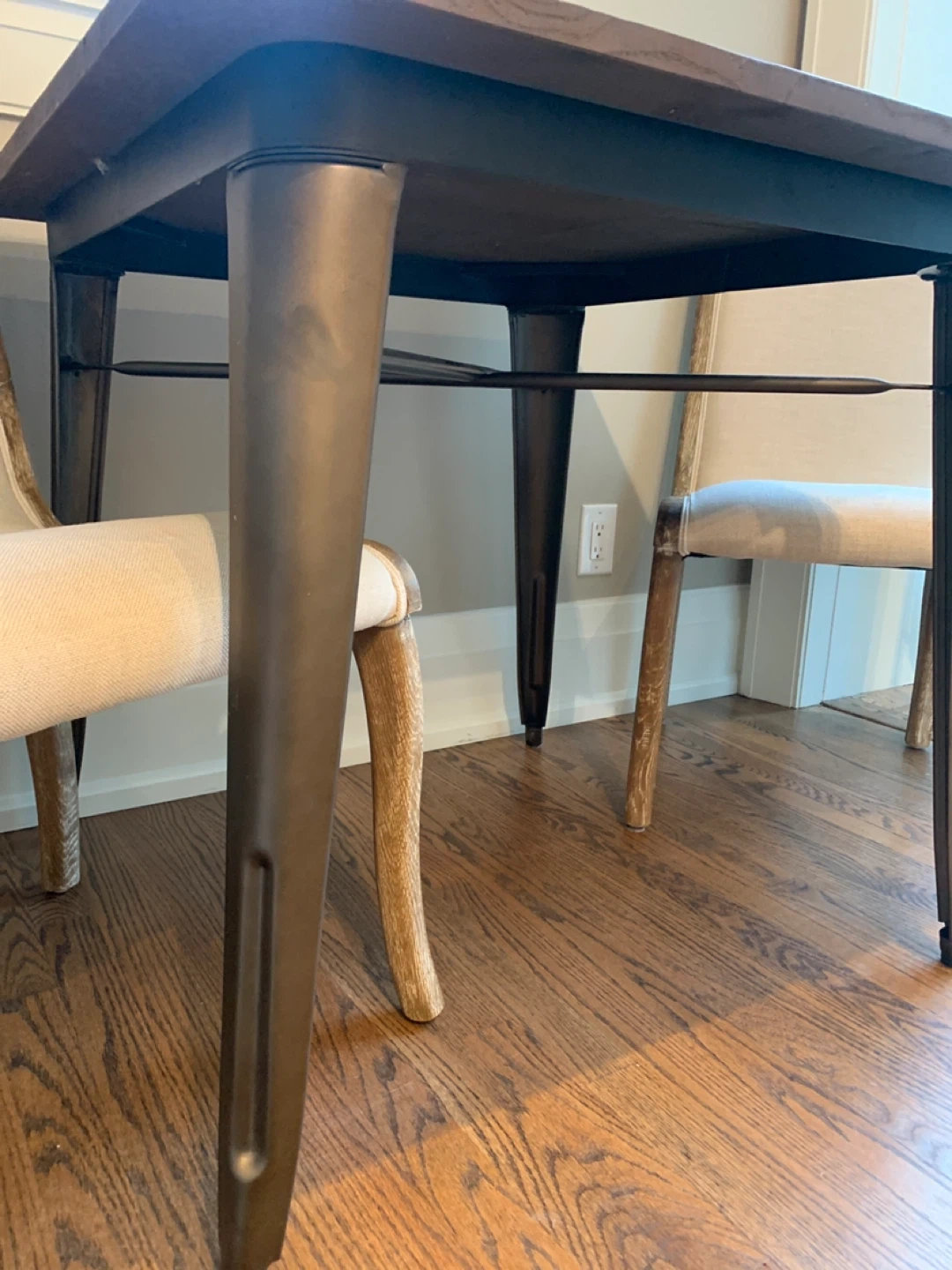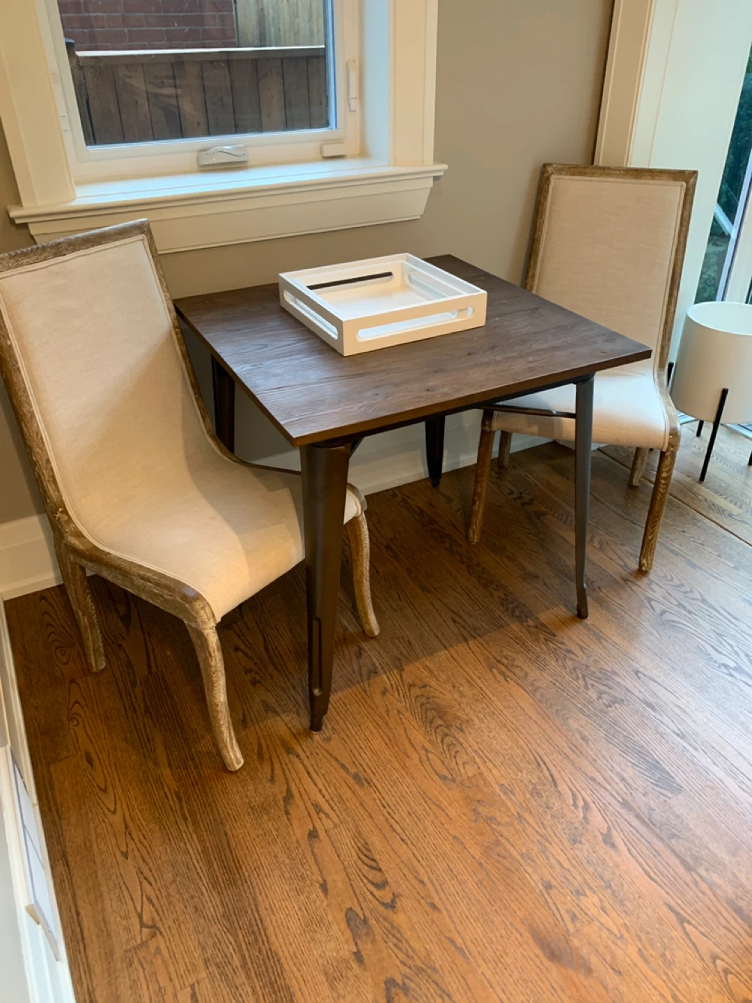 This used square dining table comes with two upholstered chairs, perfect for a cozy dining nook. The table features a sturdy construction with a wood top and metal legs, while the chairs offer comfortable seating with their neutral-toned upholstery. Additional details: * Table dimensions: 36x36 inches * Chair material: Upholstered fabric with wooden frame * Table material: Wood top with metal legs This dining set is looking for a new home! If the ad's still up, it's still up for grabs!