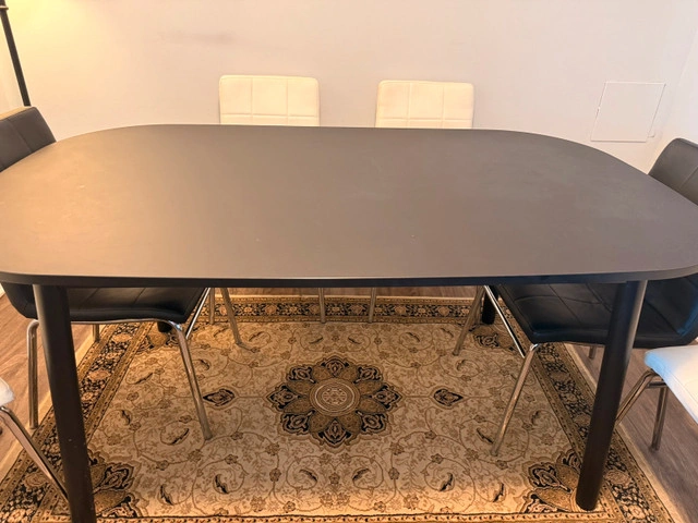 This used dining table and six chairs set is perfect for family dinners or entertaining guests. The table is sturdy and stylish, and the chairs are comfortable. Perfect for a modern dining space. Table measures 160x95 cm. * Table dimensions: 160cm x 95cm * Material: Wood * Colour: Black I'm asking 750, a fair price considering similar sets are listed on Kijiji for around $1500. If the ad is up, it's available, so no need to ask! Come and get it!
