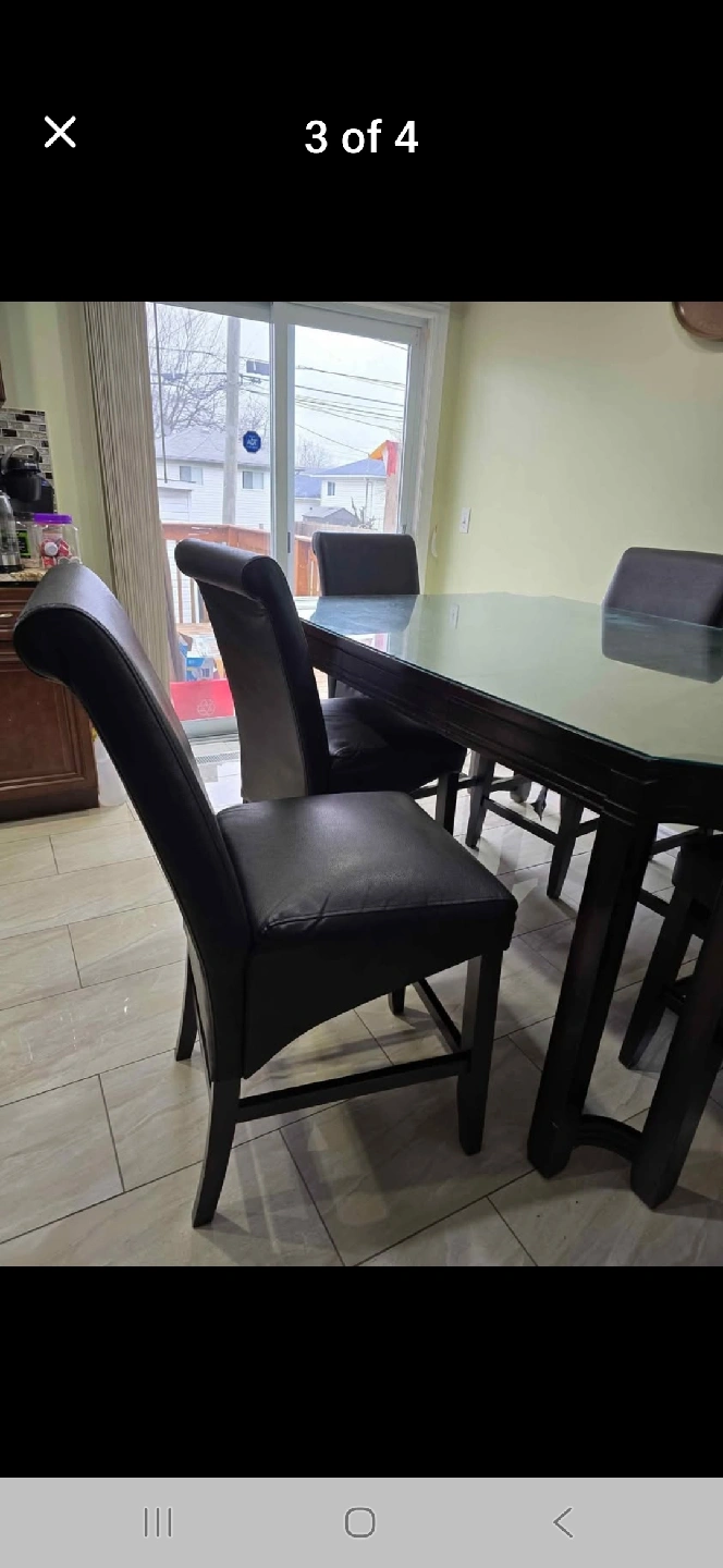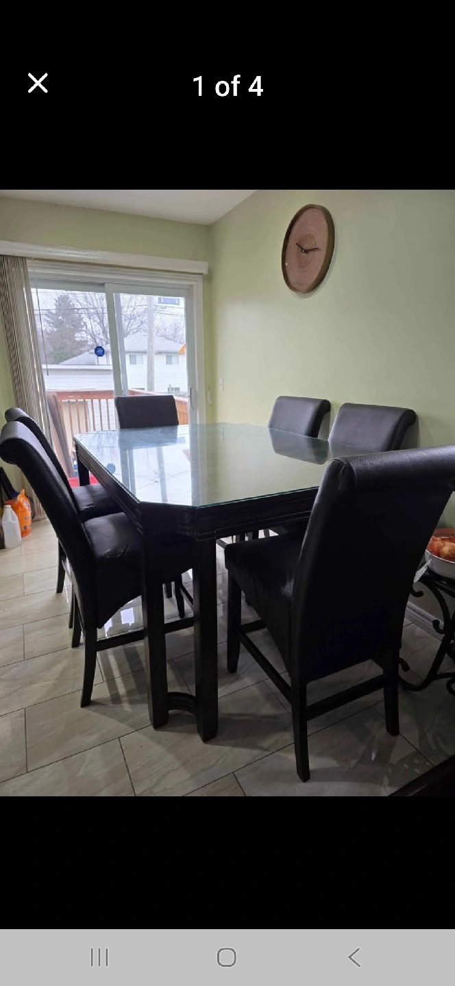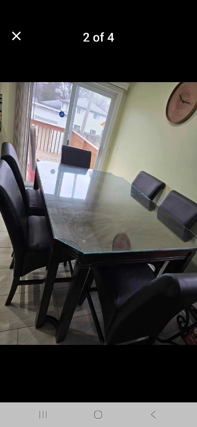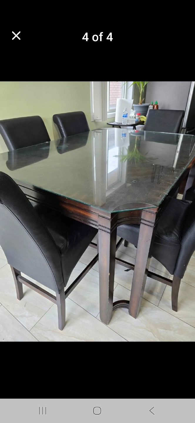 Selling a dining table set that includes a glass top table and 8 leather chairs. The set is in good condition and would be a great addition to any dining room. The chairs are comfortable and stylish, and the glass top table is easy to clean and maintain