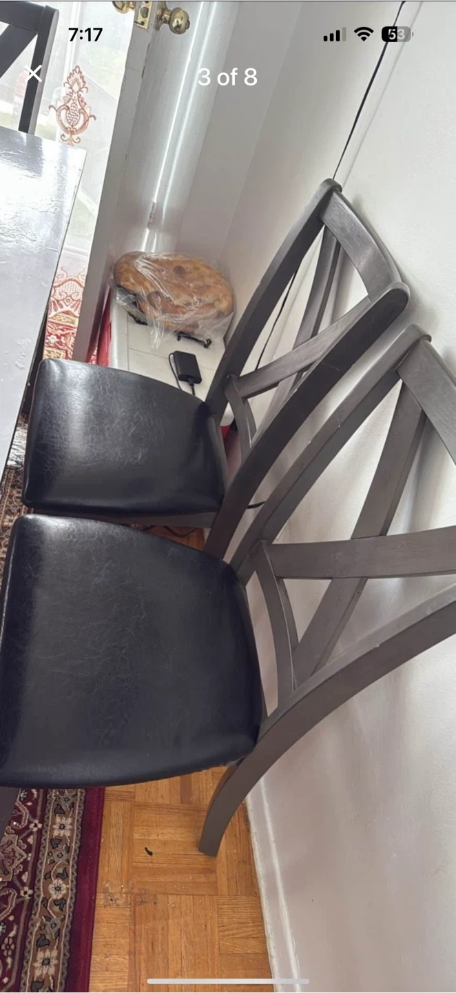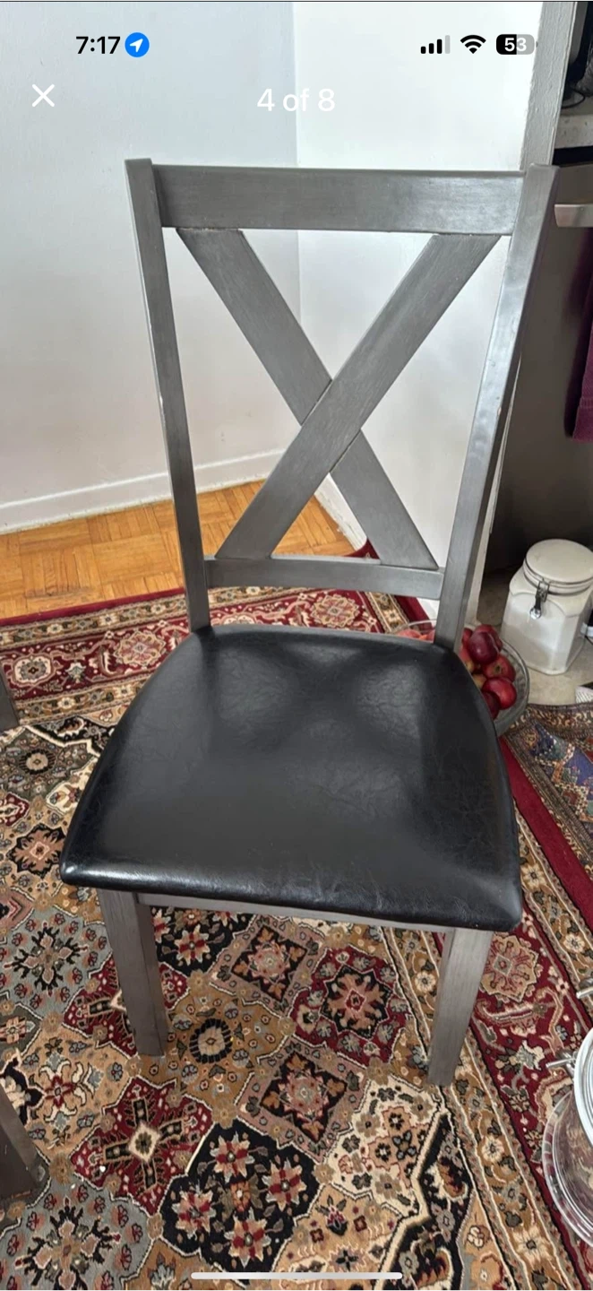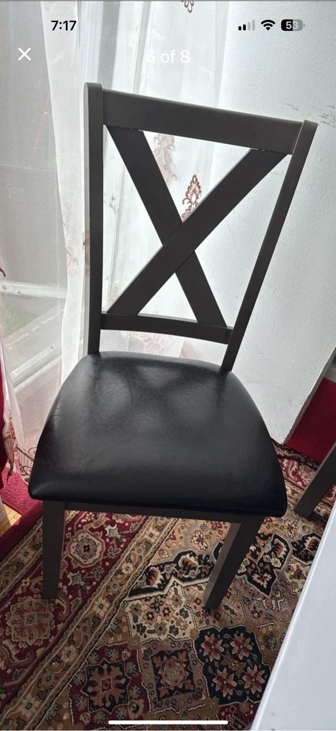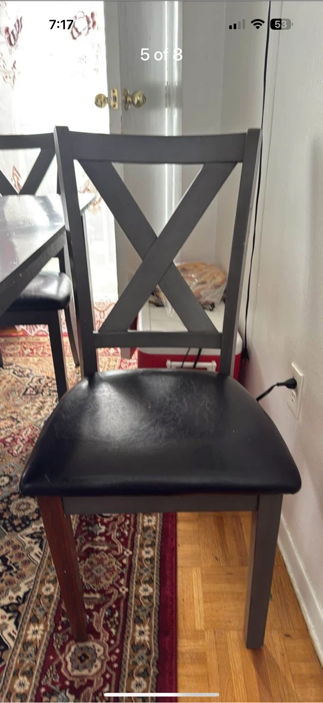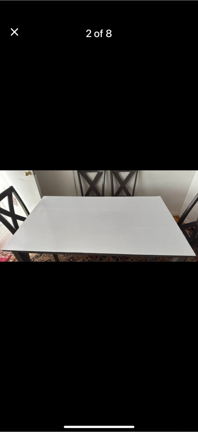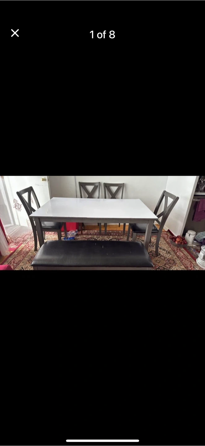Selling a dining table set that includes a table, four chairs, and a bench. The chairs have a distinctive 'X' design on the back. The table has a white top and dark grey frame. The chairs and bench have black leather seats. It's a great set for family dinners or gatherings!