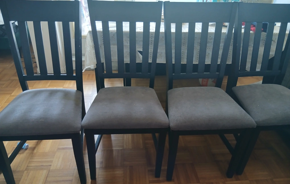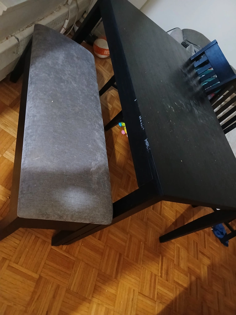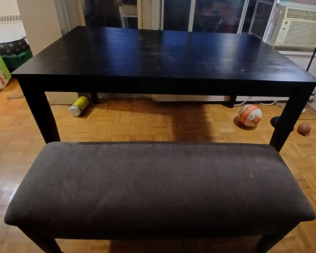 Selling a dining table with four chairs and a bench. The set is in good condition and ready for a new home. It's a great set for family dinners or gatherings with friends