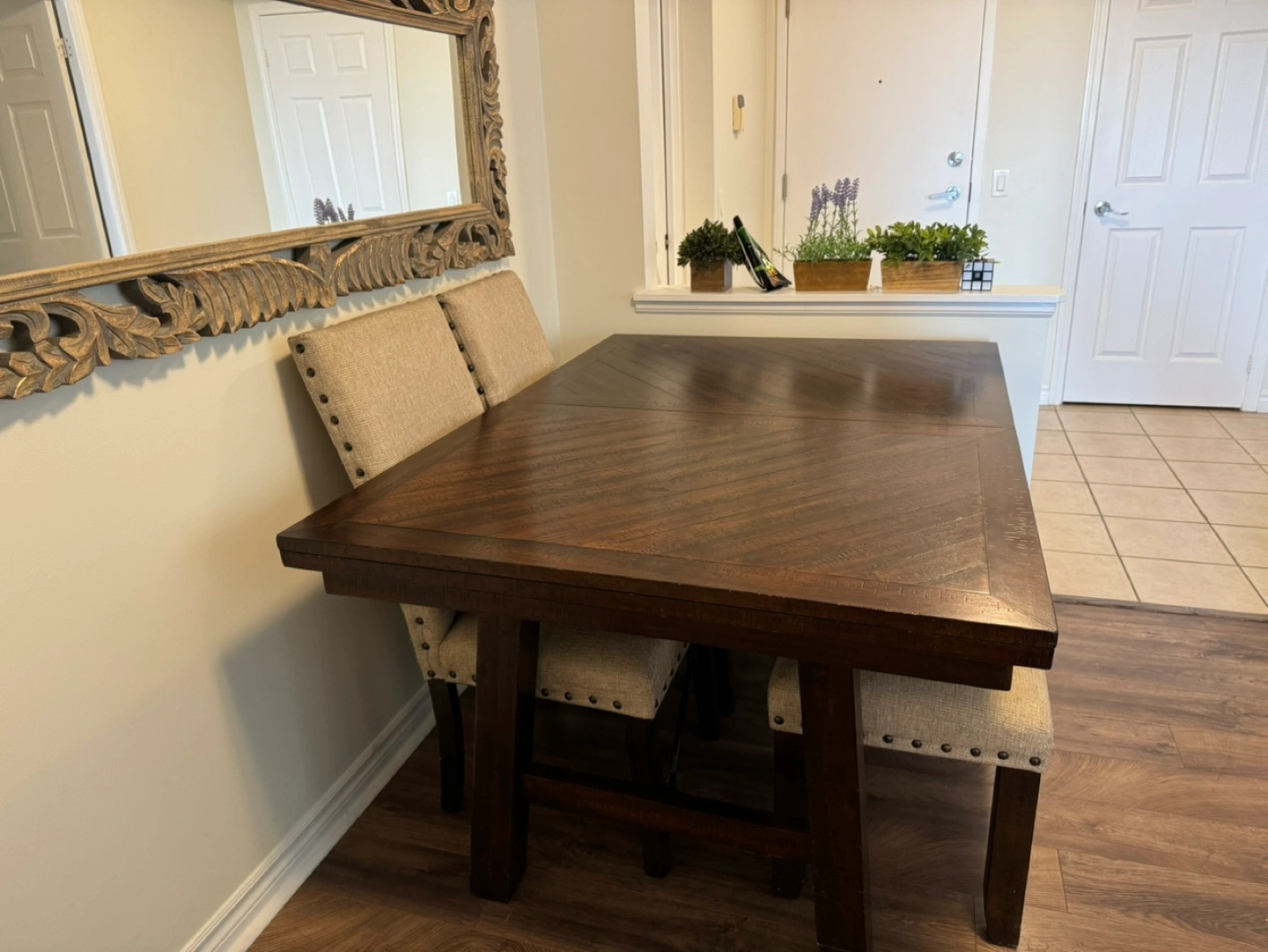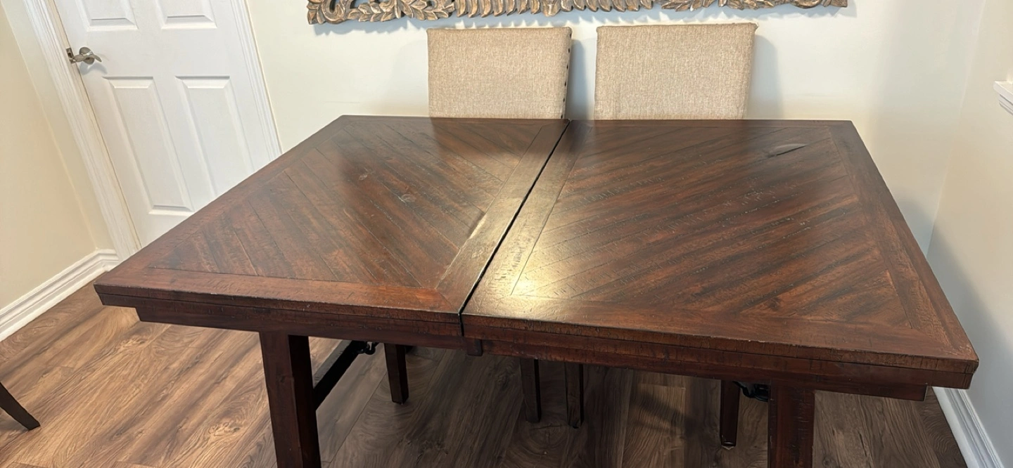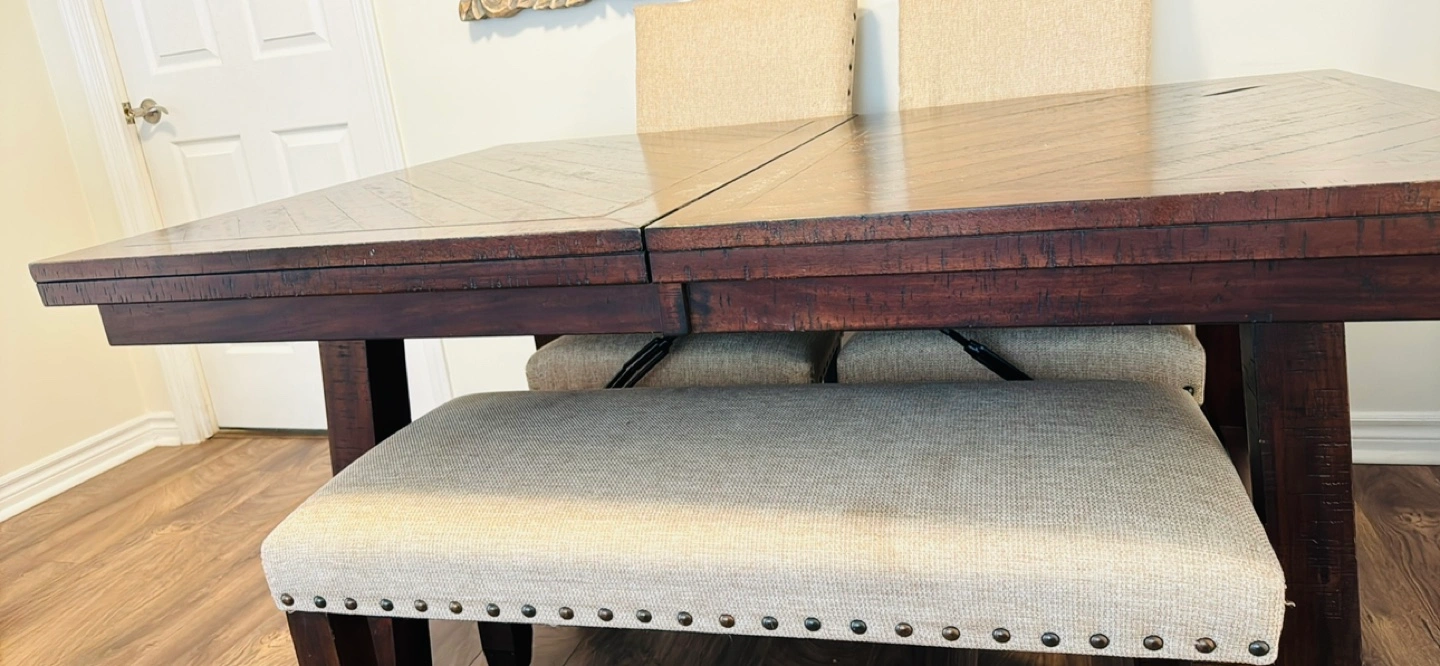 Extendable Dining table. Includes 4 chairs and a bench. The table has two raised areas due to water absorption which can be hidden with decoration pieces or placemats. Looks gorgeous!! Must see. Dimensions- 60 X 42 X 30 inches