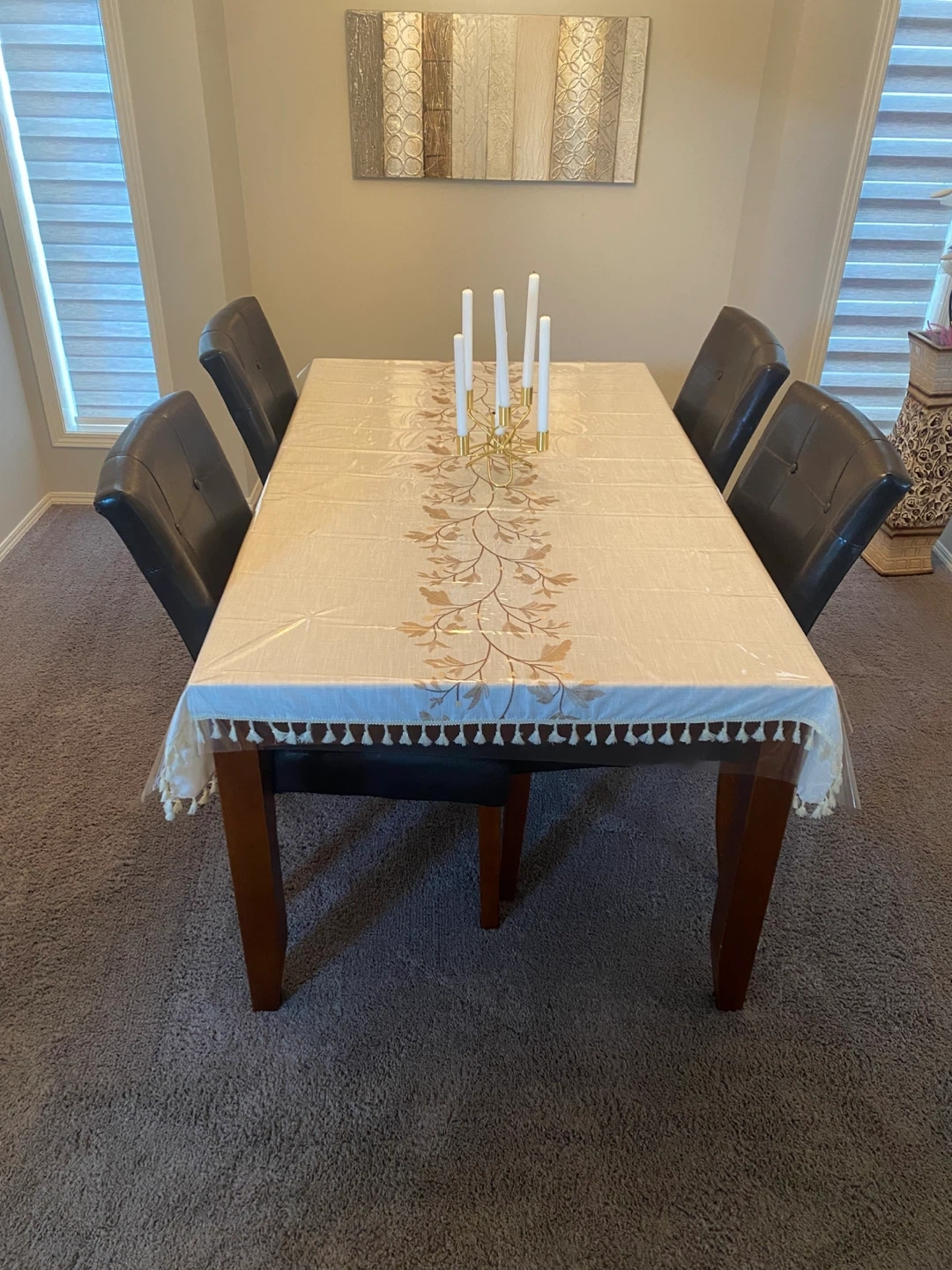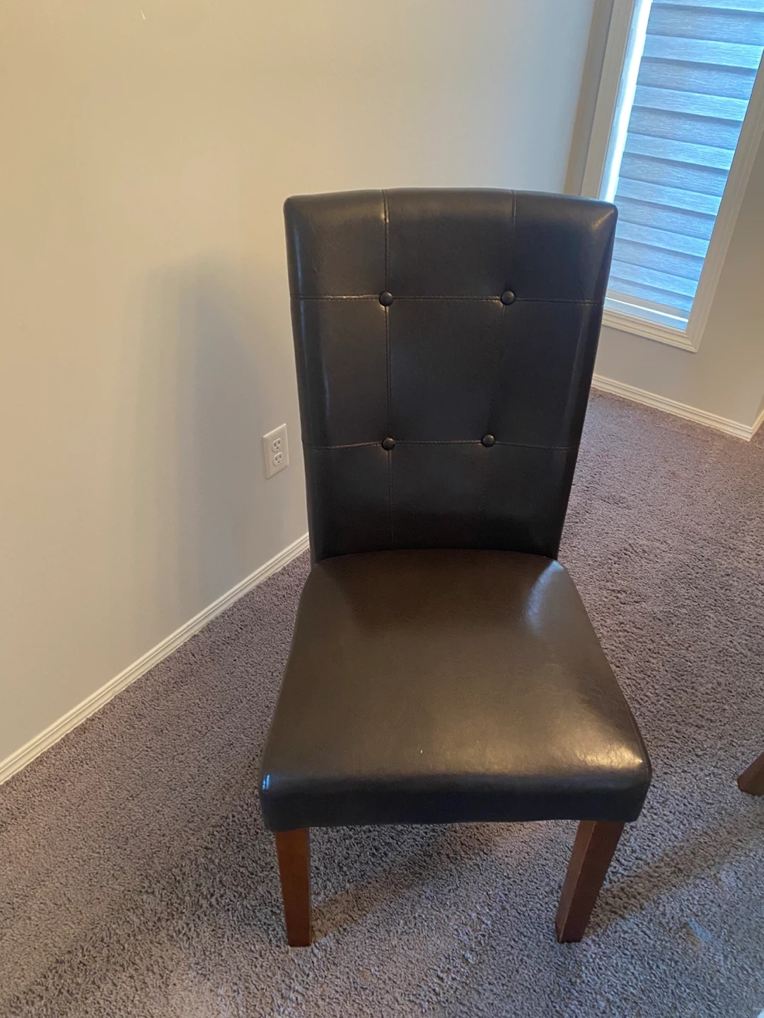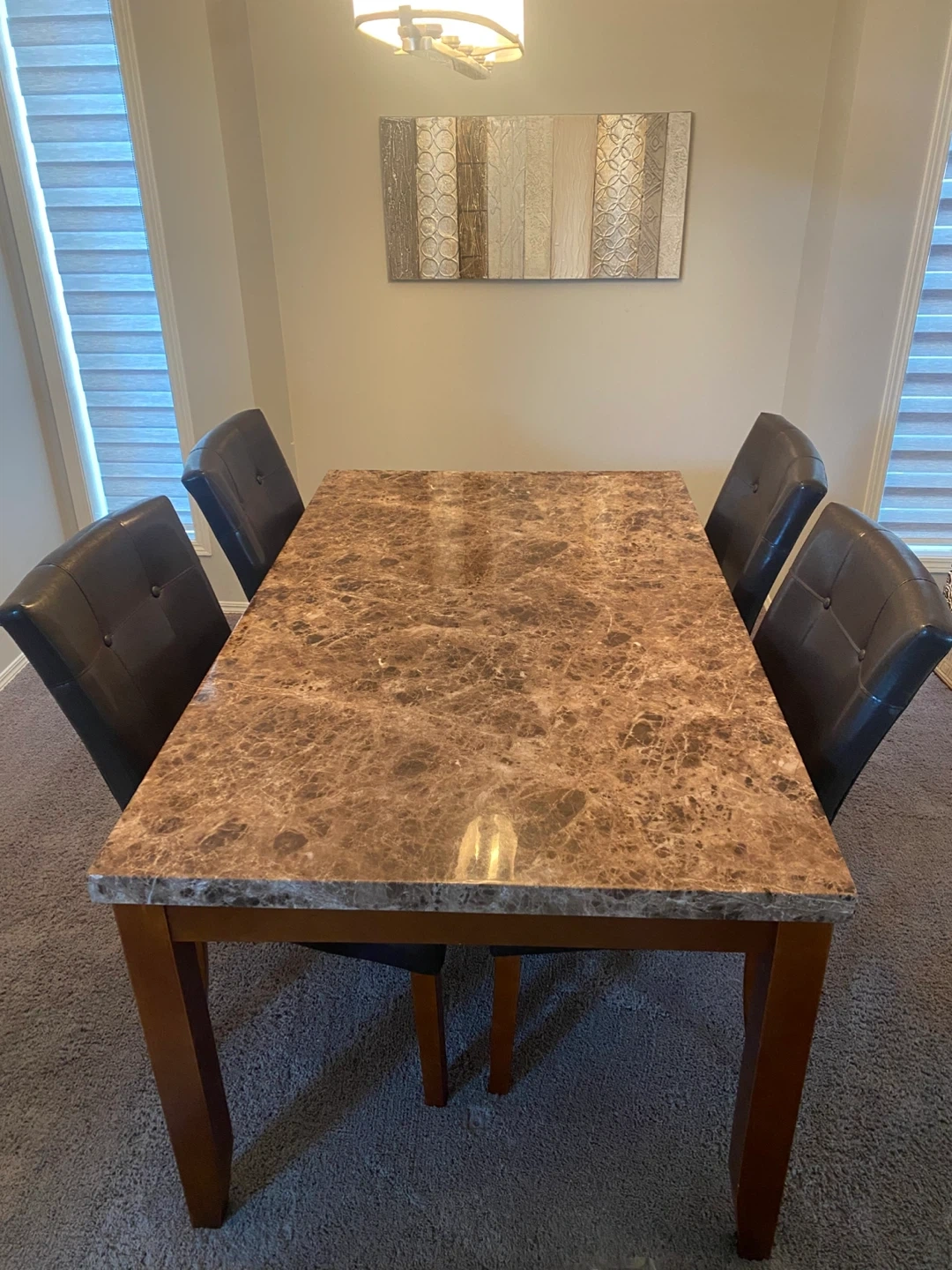 Selling a dining table with four chairs. The table has a brown marble-patterned top and wooden legs. The chairs are dark brown with a buttoned back design. Perfect for a small dining area! Moving sale