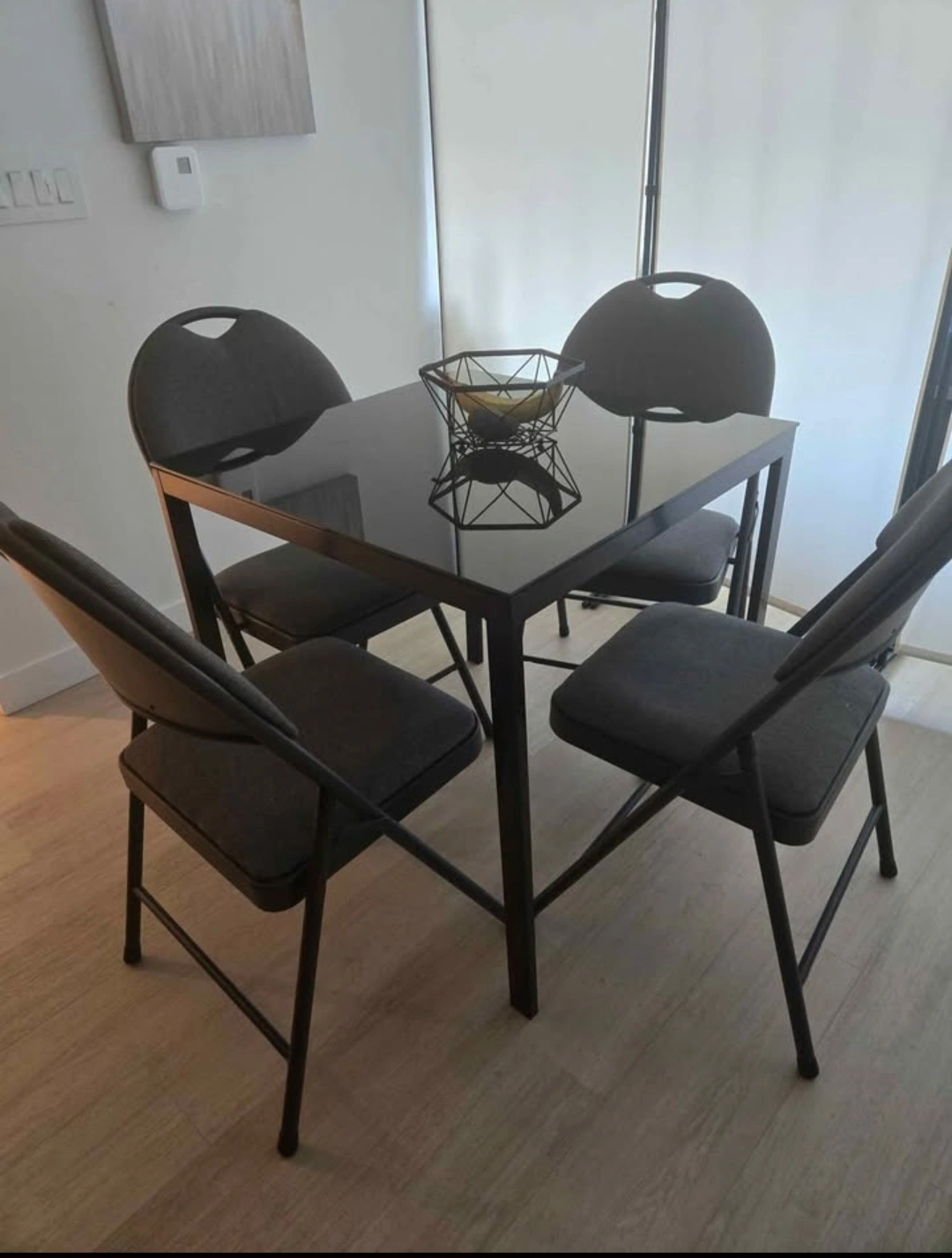 Selling a dining table with four folding chairs. The set is in good condition and features a black finish. Perfect for small spaces or anyone needing a flexible dining solution!